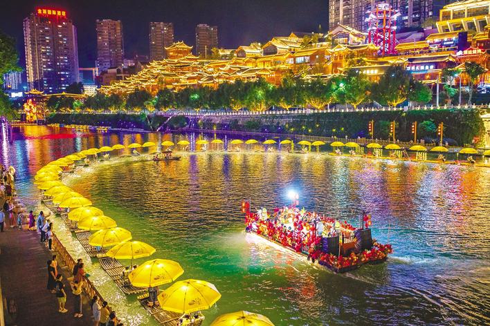 8 月 7 日晚,游客在宣恩县城仙山贡水旅游区游览。近年来,宣恩县以水为媒,举办多种活动,将山区县城打造成周边省市游客赏夜景的旅游目的地。