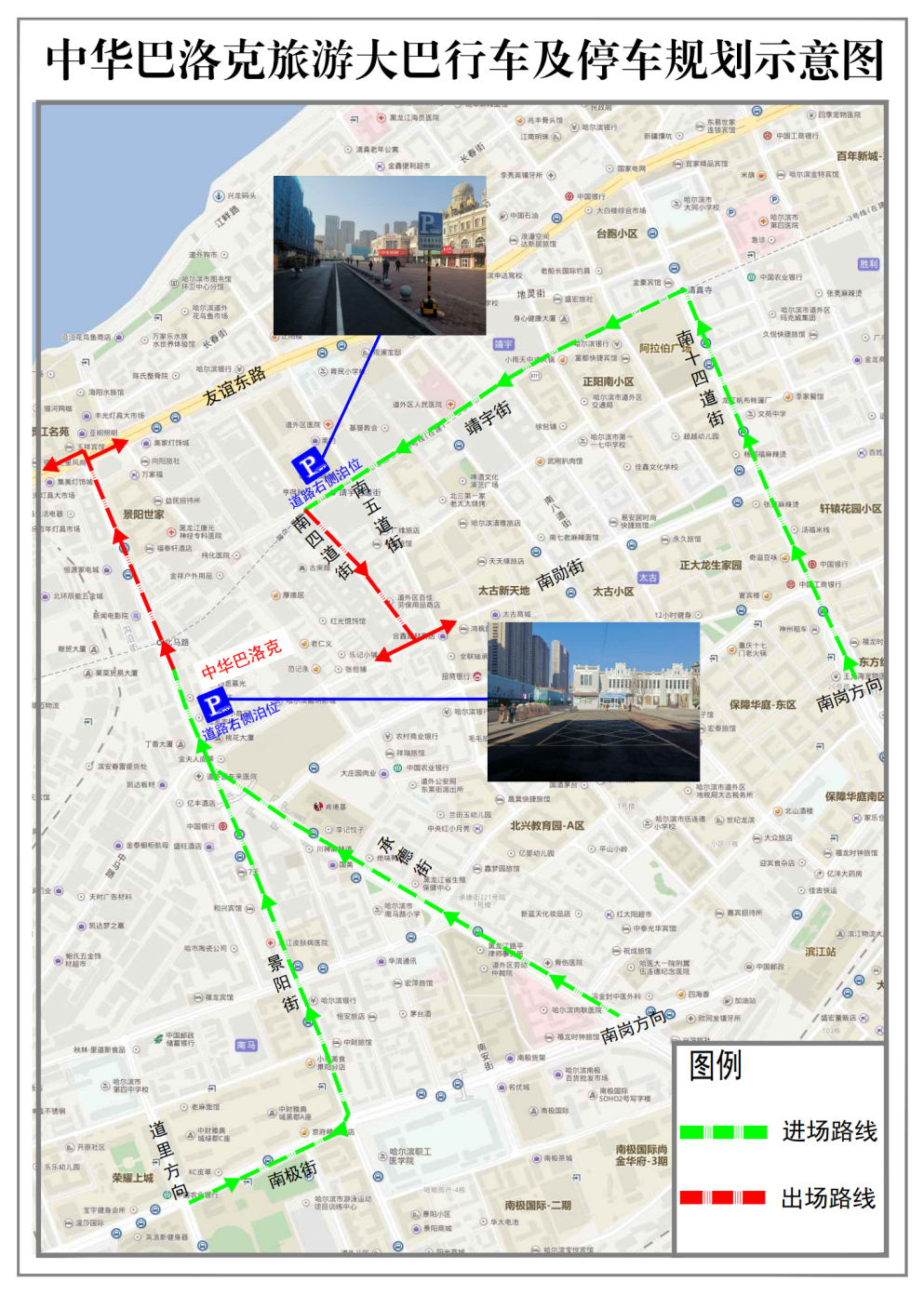 去往道外区中华巴洛克,可经南极街、承德街、景阳街,在巴洛克广场大客车停车场临时停放。或经友谊东路、十四道街、靖宇街,停放在靖宇街温州商城前旅游大巴车临时停靠站,驶出车辆可经南四道街、南勋街前往景阳街或南十四道街。