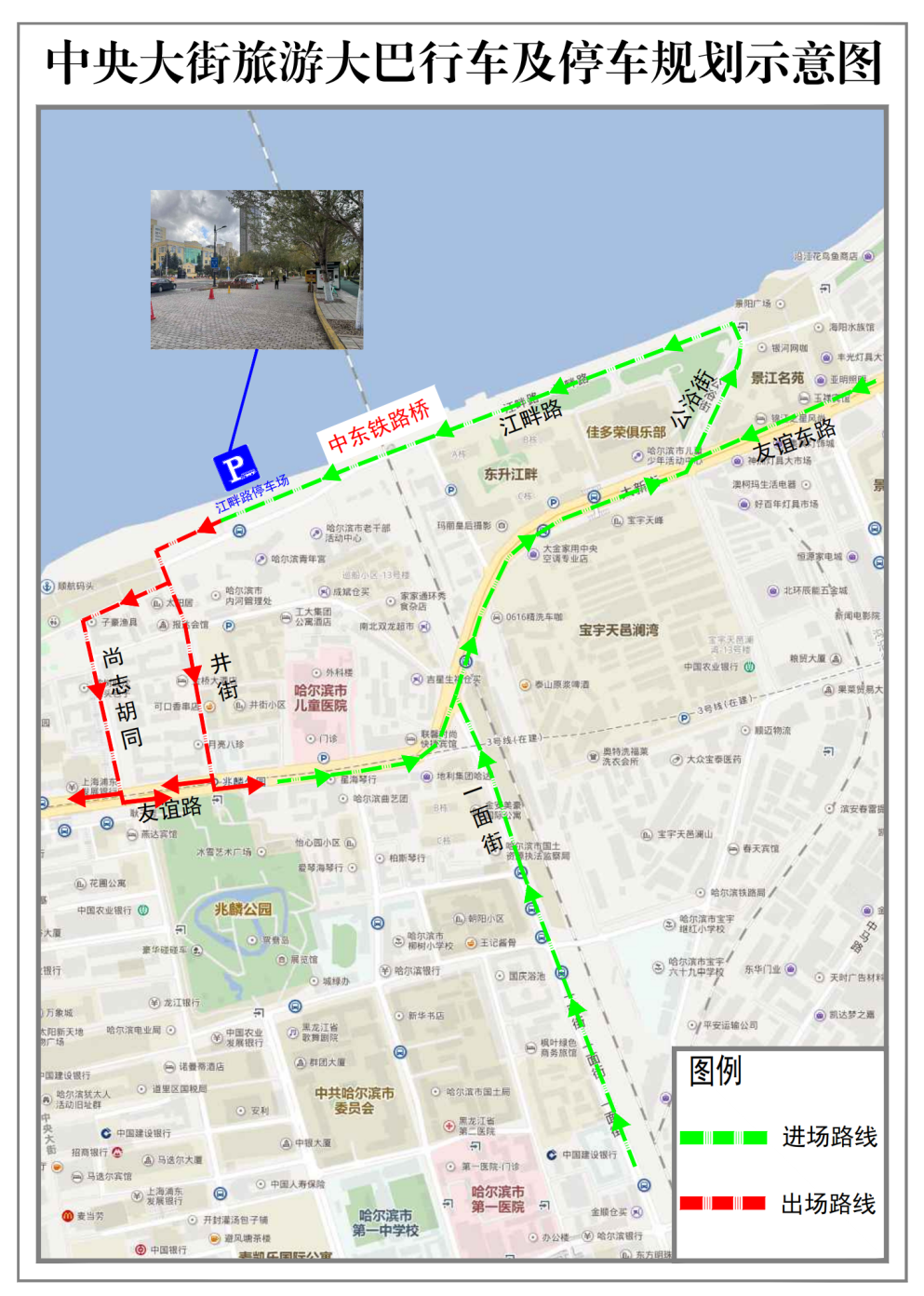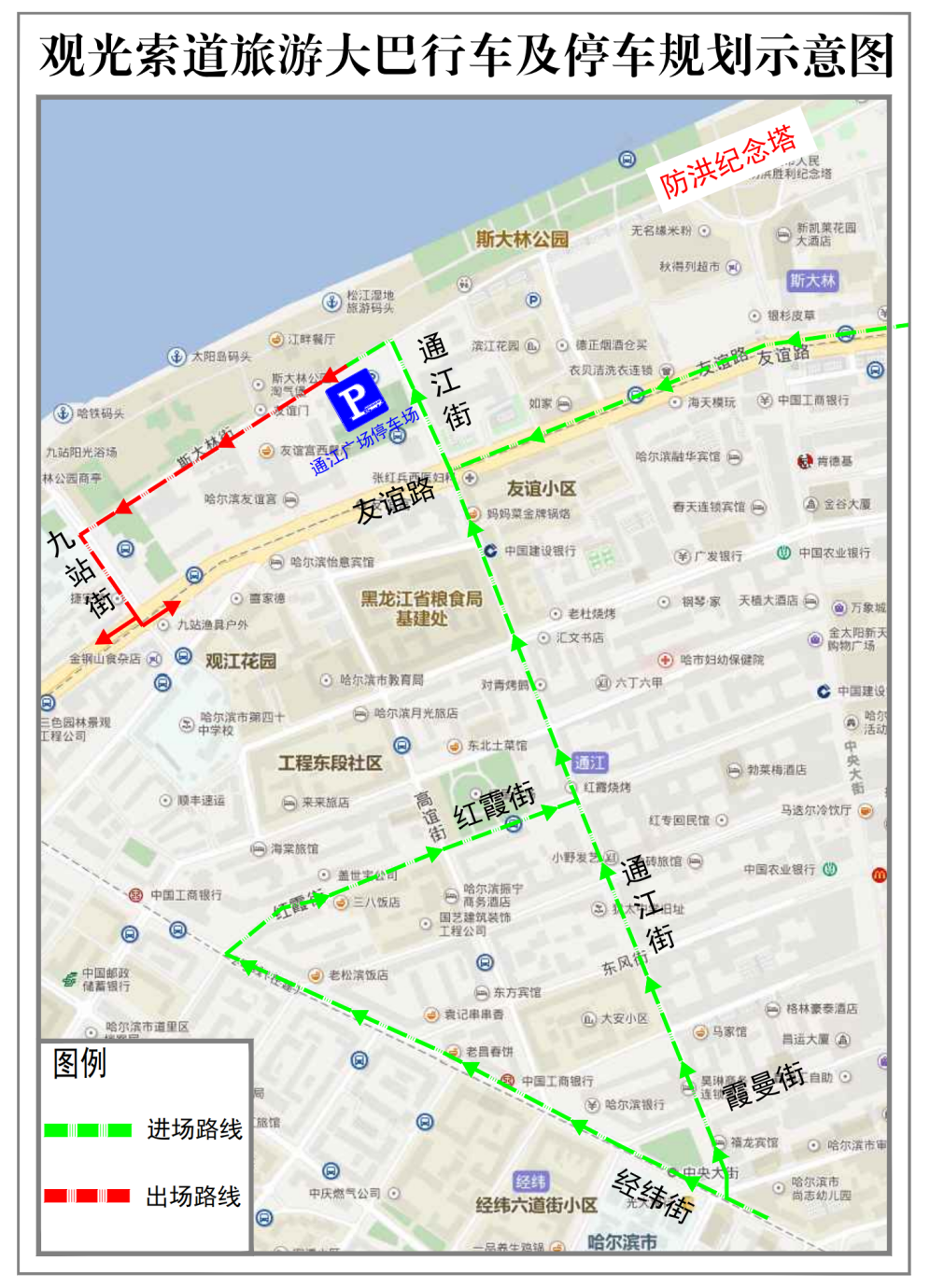 去往松花江观光索道、中央大街的,可经友谊路、通江街,进入通江街停车场;驶出车辆可经防汛路、九站街前往友谊路。