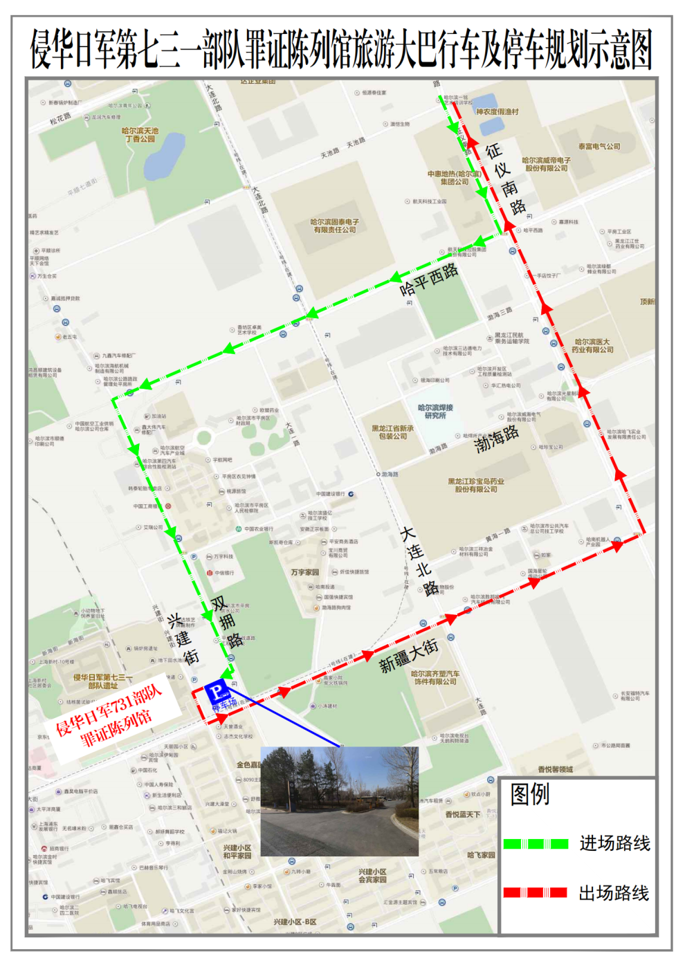 市区前往侵华日军731部队罪证陈列馆的,可经征仪路、哈平西路、双拥路,进入大巴车停车场,驶出车辆请从兴建街、新疆大街返回。