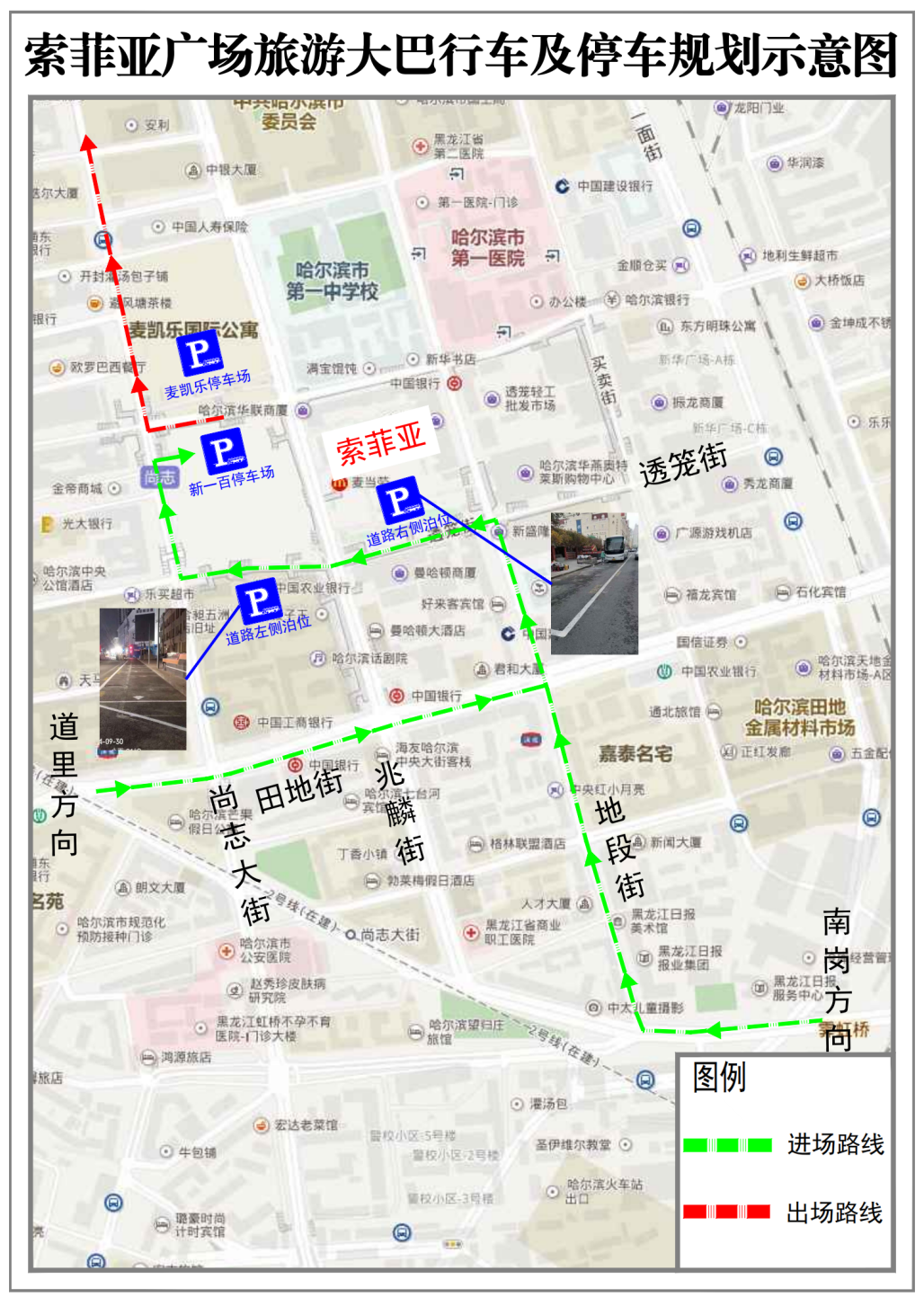 旅游大巴去往索菲亚广场的行车规划路线为田地街、地段街、透笼街,可在透笼街(地段街至兆麟街)路段北侧、(兆麟街至尚志大街)路段南侧临时停放,长时停放的车辆可经尚志大街进入哈一百、麦凯乐停车场。