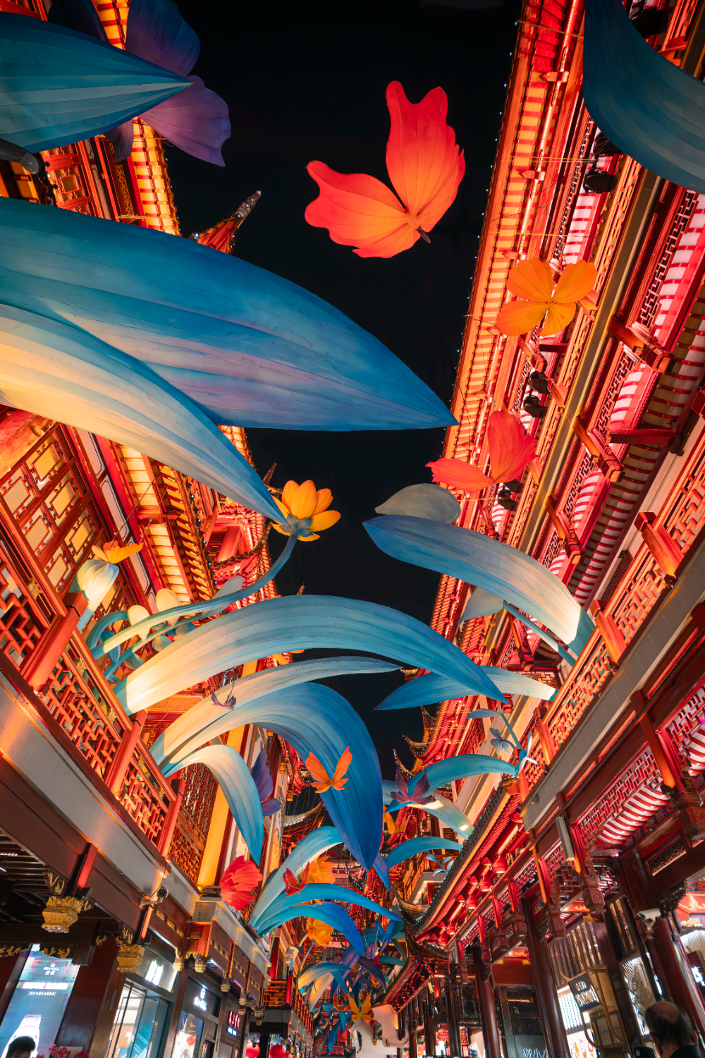 走进黄金广场,生长着一颗生命之树,展现人与自然,万物共生的亲密关系。凝晖路化身蝴蝶谷,营造出“逍遥物外,庄周梦蝶”的梦境。中心广场呈现“天地人和,金蛇献瑞”的热闹丛林景象。走进九曲桥,仿佛走进“众生奇妙,丛林乐园”,展现一幅绚丽的画卷。豫园老街展现豫园灯会30年的灯彩历程,从中国十大灯彩流派中,选其经典造型精细还原,营造出“花市灯如昼”的沉浸感。