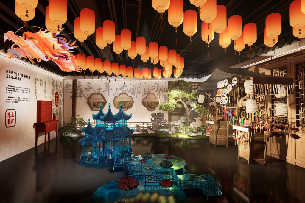 中国灯会民俗以及灯彩艺术的发展,与春节这一传统节日息息相关。“不止灯彩”展将10幅上海图书馆的精品馆藏——小校场年画“邀请”至展馆内,以光影技术打造节日场景,再现百年前以豫园地区为核心的上海老城厢年味年俗。