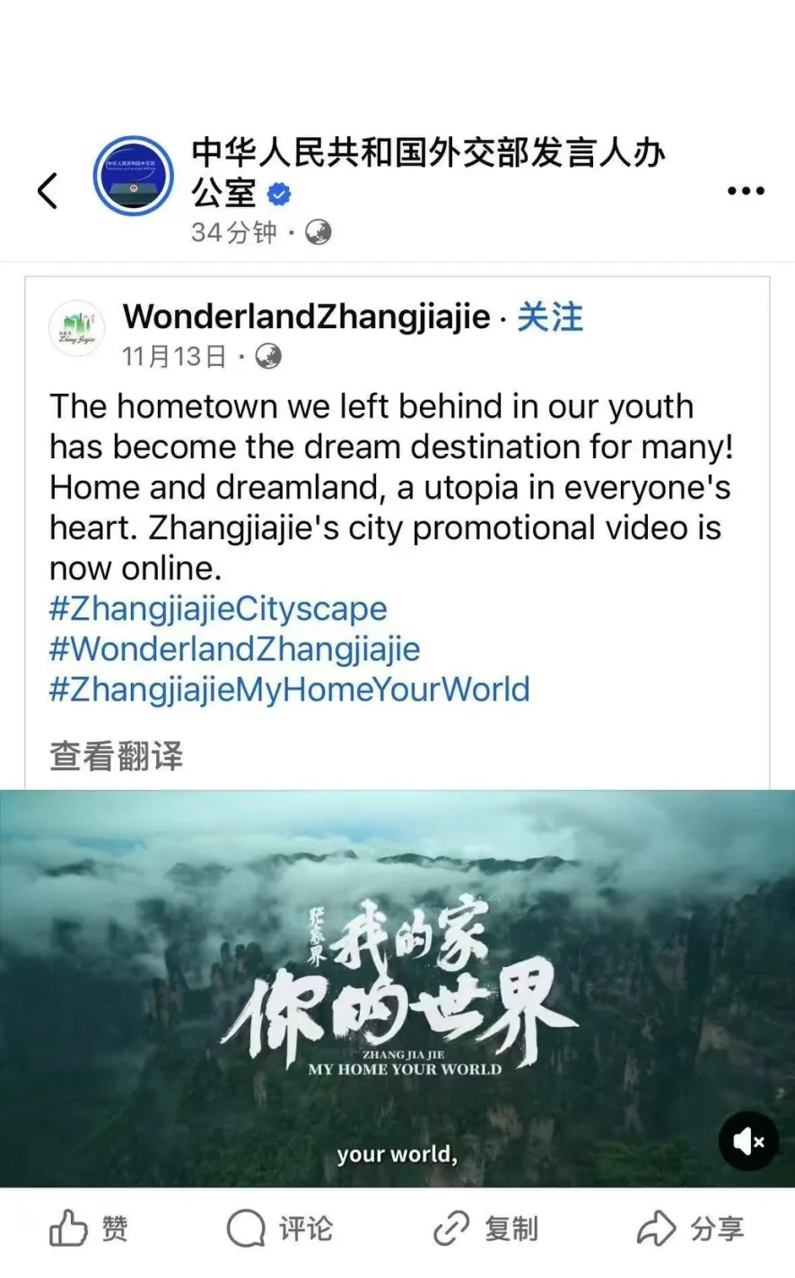 △外交部发言人办公室海外账号转发《我的家,你的世界》