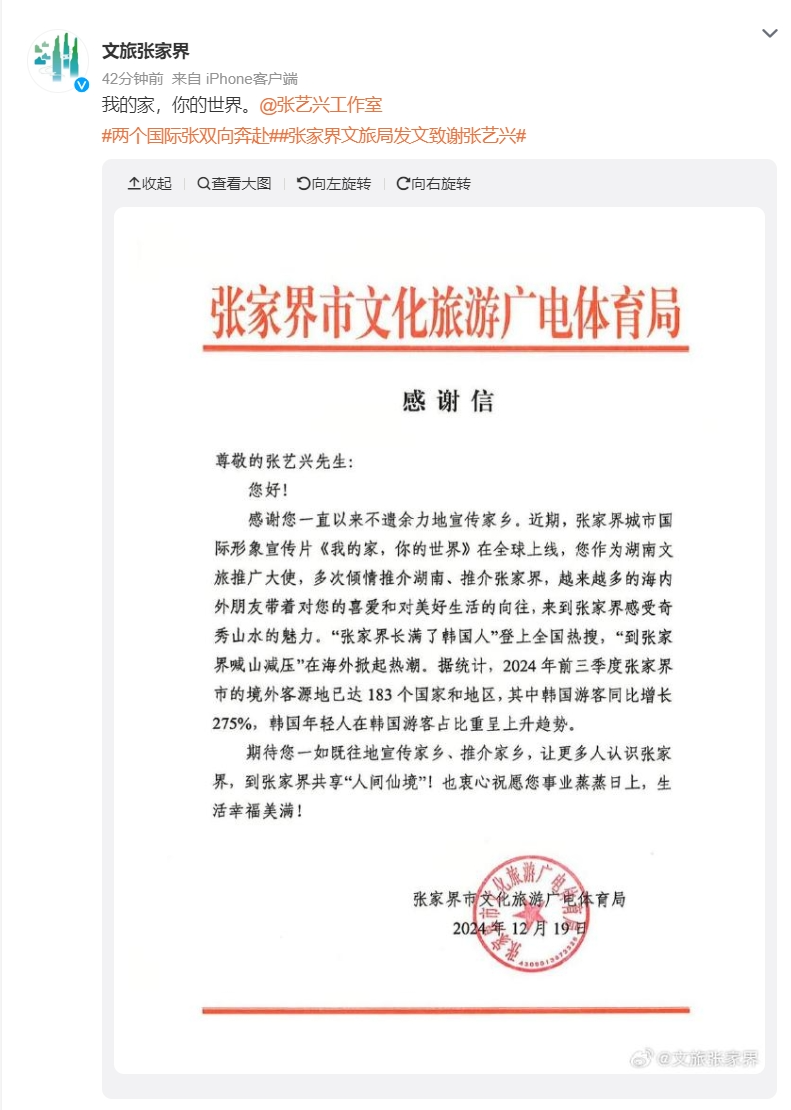 12月19日,张家界文旅发布感谢信,感谢艺人张艺兴,并表示是“两个‘国际张’的双向奔赴”。
