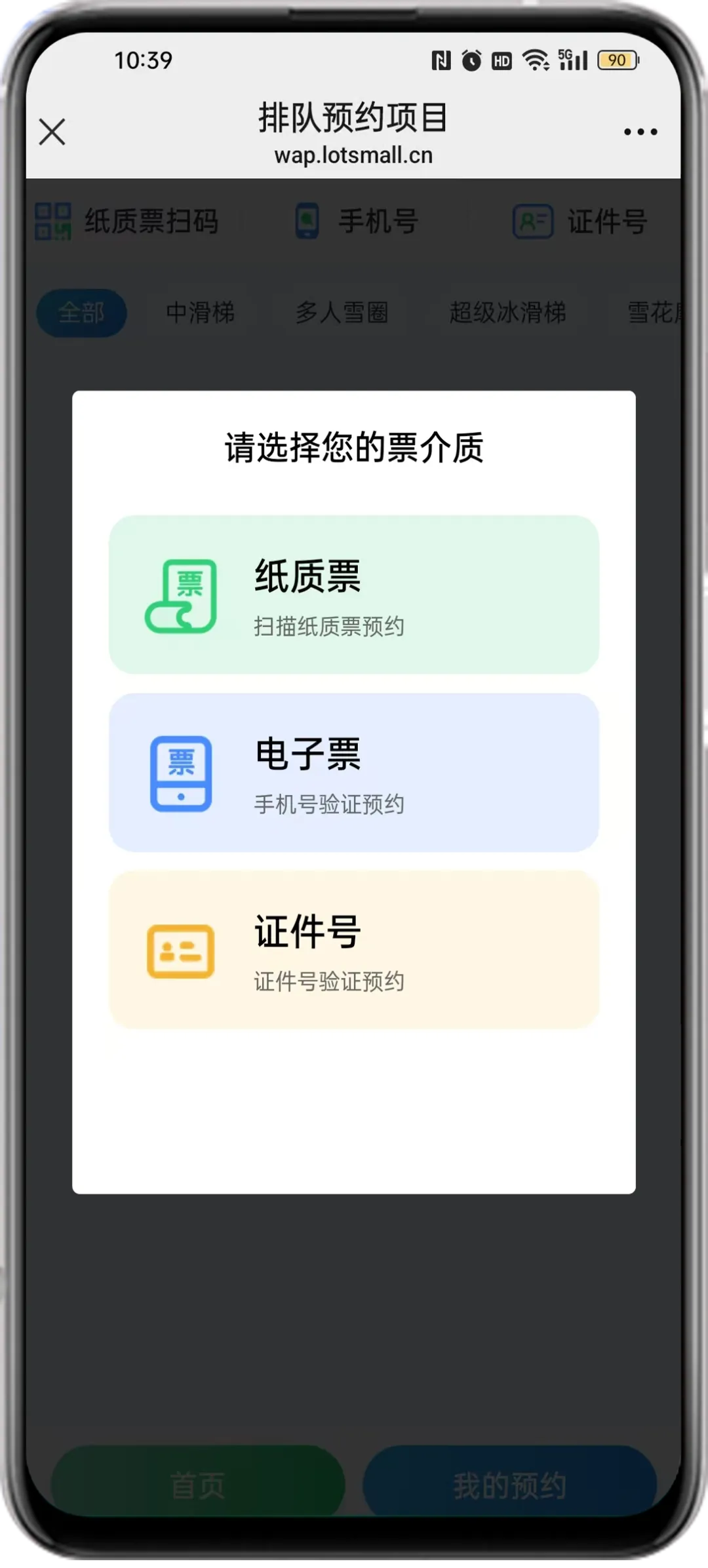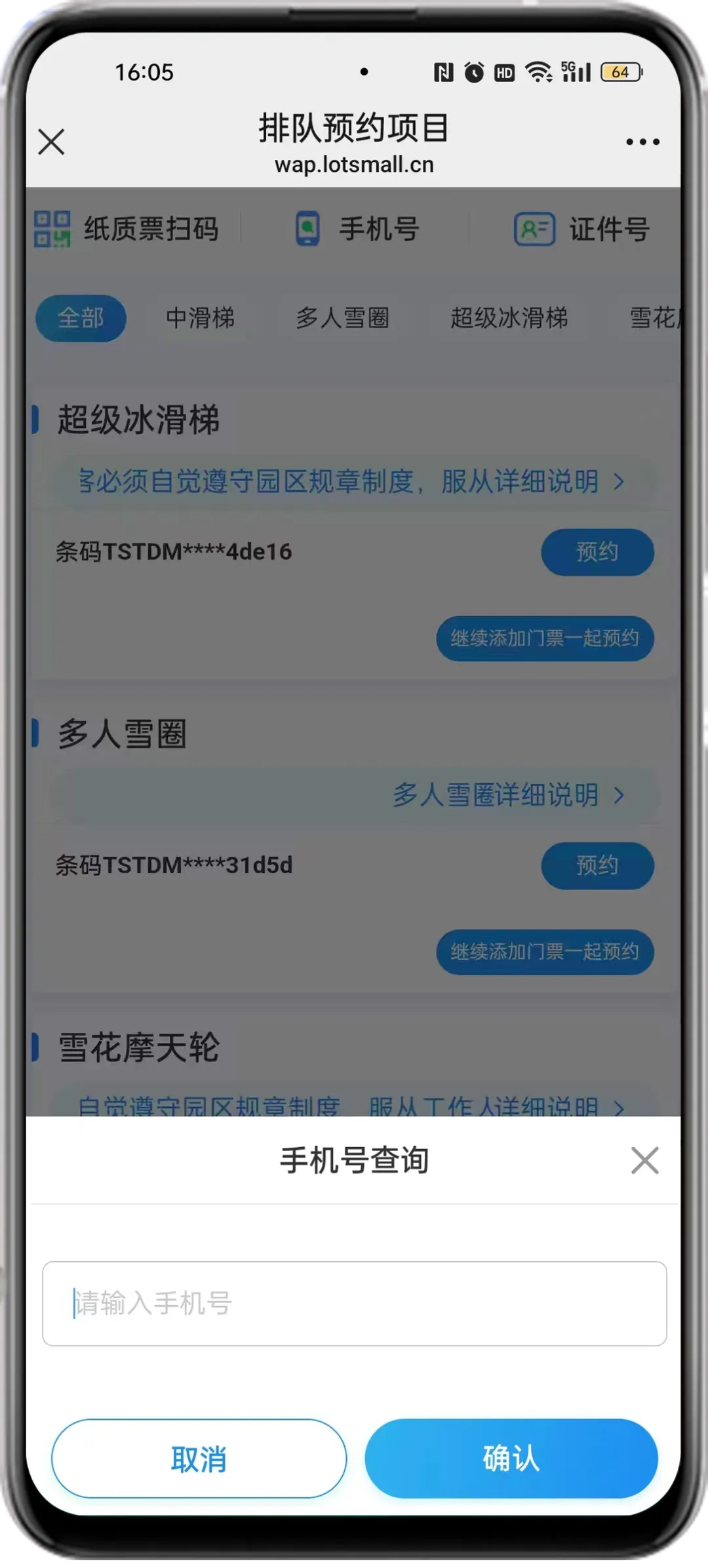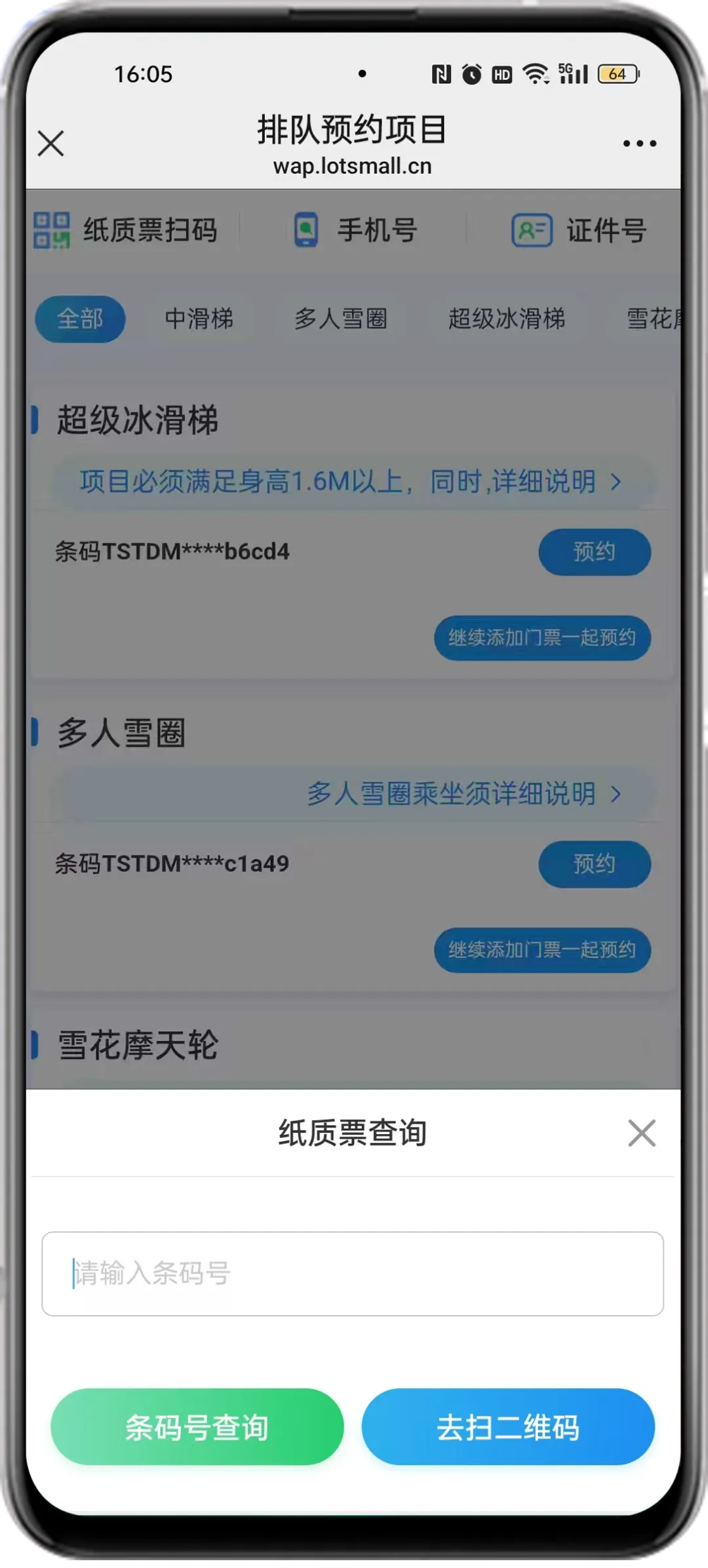 1.通过校验纸质门票进入预约界面的游客,可输入票号或扫码条码进入项目预约界面。