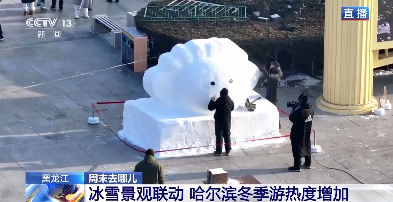 从今天凌晨开始,有3名雪雕老师就开始一个雪雕饺子的创作。在冬至,北方有习俗要吃饺子,所以太阳岛景区就有了这样独特的设计,用雪雕呈现出来一个白白胖胖的饺子。