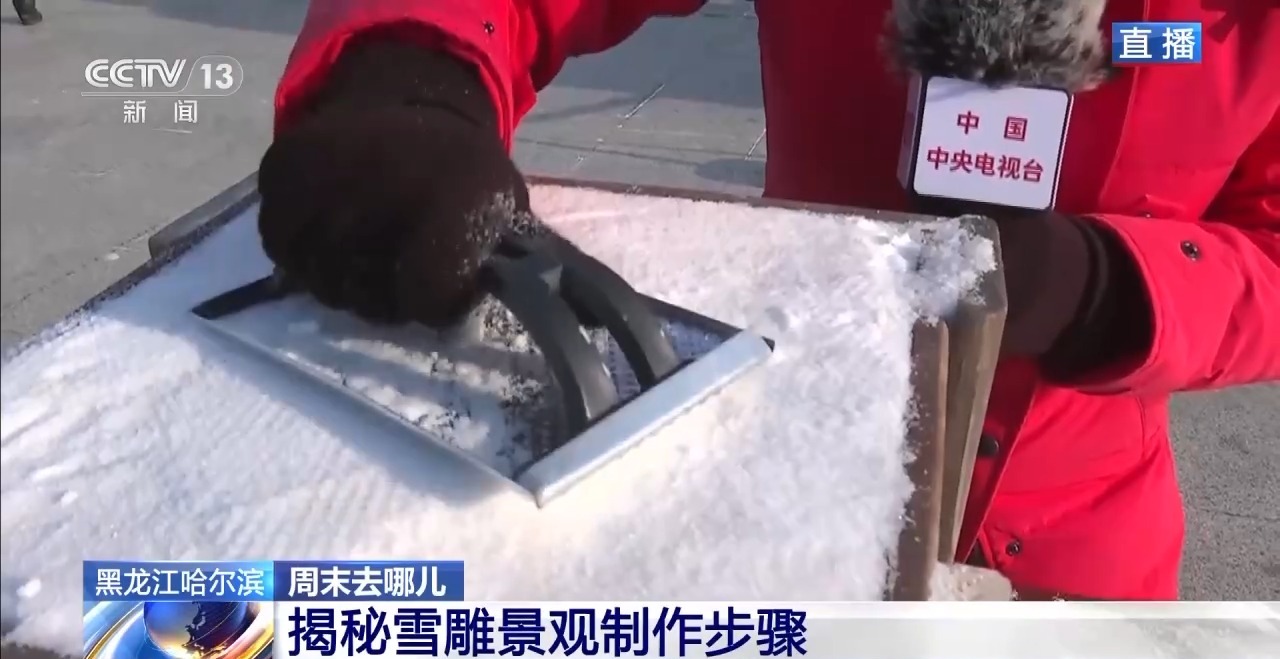 每一个雪雕作品在制作之前都要根据尺寸来制作一个木框,而在雕刻之前,园区就会把这些人造雪,一层一层地填到木框里面。