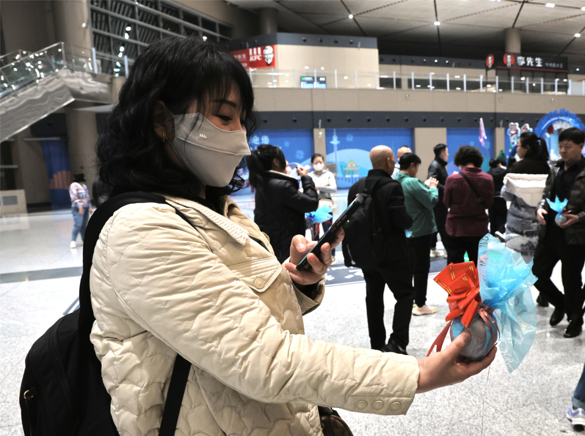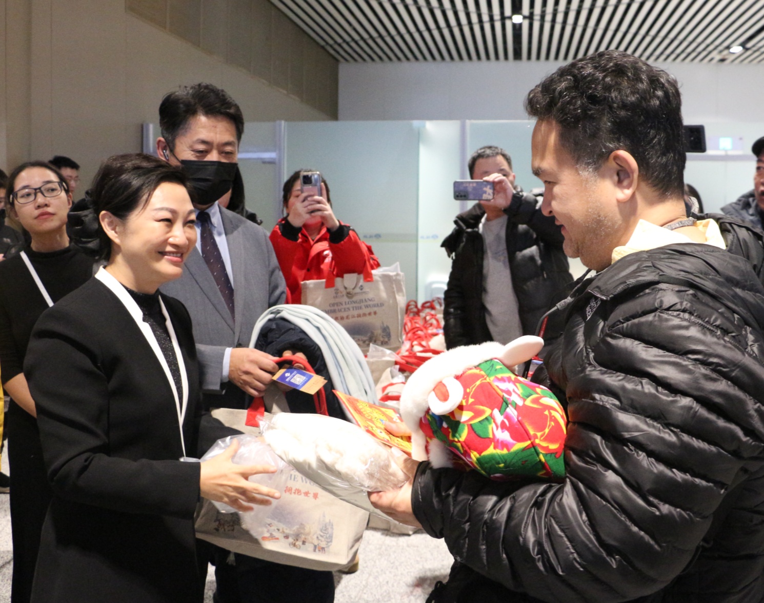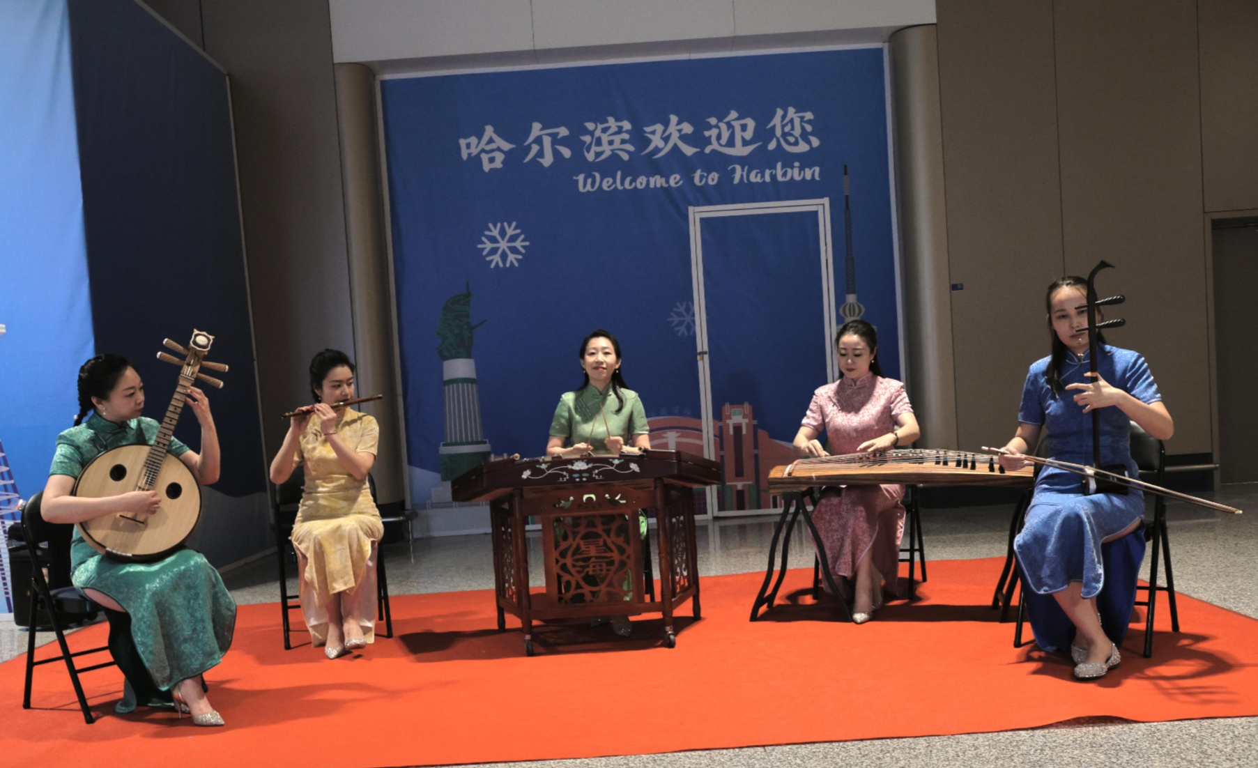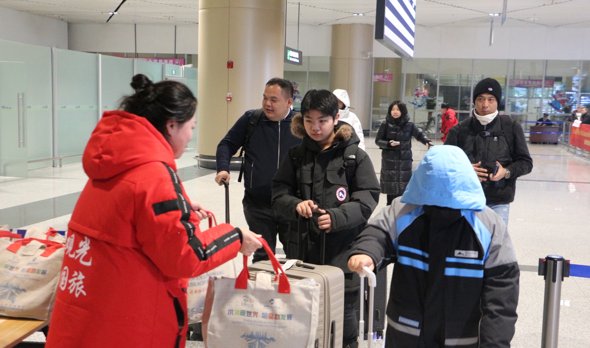 红地毯上,黑龙江艺术职业学院共5位老师,用古筝、长笛等乐器,现场演奏东方古乐,奏响了和谐典雅的迎宾曲。黑龙江省文旅厅专门为来自热带地区的游客精心准备了棉帽子、棉手套、棉围脖等御寒物品,为游客送来了温暖。