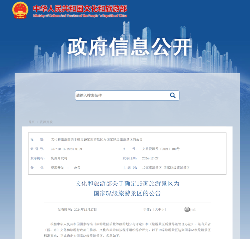 12月27日,文化和旅游部发布《关于确定19家旅游景区为国家5A级旅游景区的公告》。根据中华人民共和国国家标准《旅游景区质量等级的划分与评定》和《旅游景区质量等级管理办法》,经有关省(区、市)文化和旅游行政部门推荐,文化和旅游部按程序组织综合评定,19家旅游景区达到国家5A级旅游景区标准要求,正式确定为国家5A级旅游景区。其中,黑龙江省齐齐哈尔市扎龙生态旅游区入选。