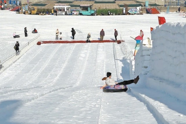 市民在龙潭冰雪节上感受冒险的乐趣。