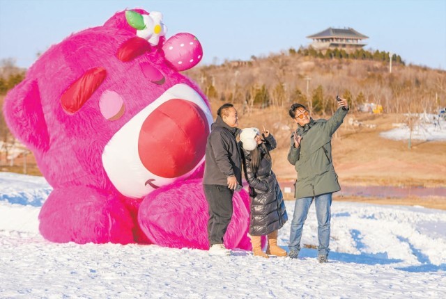 这里还有官方授权的“草莓熊”主题。憨态可掬的粉色小熊巨型布偶静卧岛上,成为皑皑白雪上的一抹亮色。游客与可爱爆棚的小熊、相距不远的南森“燕景台”同框拍照,别有一番意趣。如果玩累了,还可以在岛上的“大草帽休闲区”帐篷里,品尝雪地火锅。