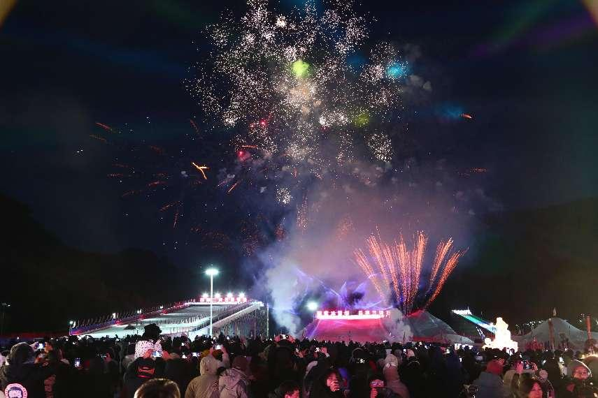启动仪式现场群山披雪银装素裹,灯海冰雕璀璨夺目,歌舞飞扬人头攒动,滑冰嬉雪热闹非凡,特产美食应有尽有,七百架无人机在夜空中作画,五彩缤纷的烟花闪耀大地。以冰雪为媒,迎八方来客,抚顺县为游客打造了一个美轮美奂、异彩纷呈的冰雪新天地。