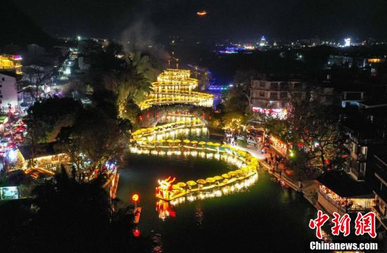 28日晚,在广西桂林阳朔遇龙河景区的金龙巡游表演(无人机照片)。杨宗盛 摄