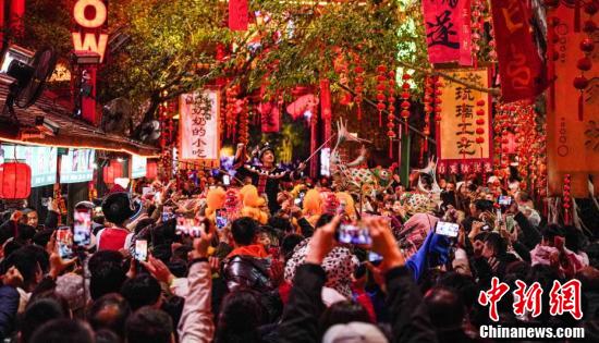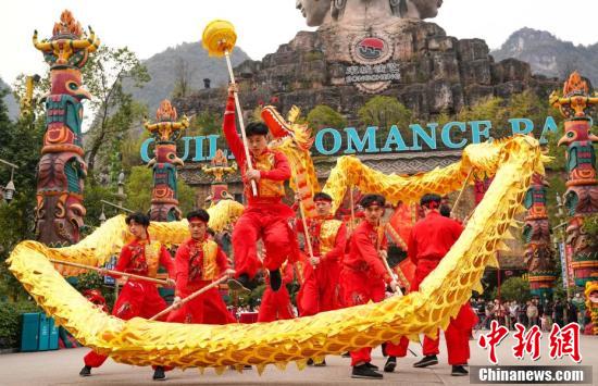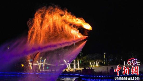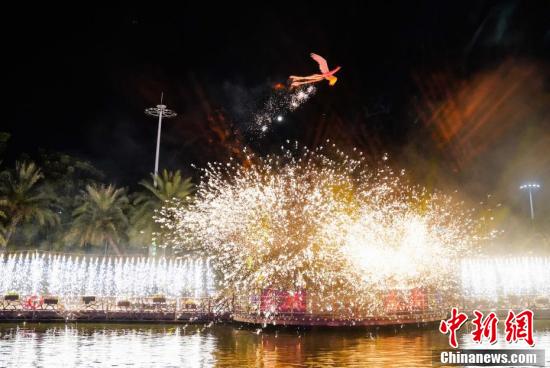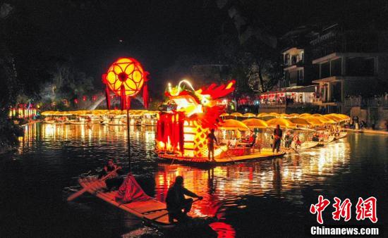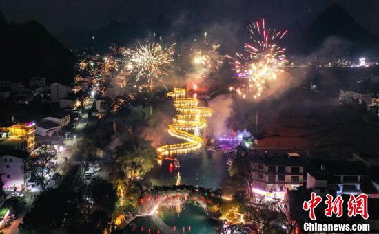 12月27日至28日,广西桂林阳朔县举办第二十四届漓江渔火节,本届漓江渔火节以“渔火浪漫你我非遗狂欢阳朔”为主题,通过开展形式多样、内容丰富的活动,展现了阳朔特有的文化风情,吸引更多游客感受阳朔的山水之美、人文之美。图为28日晚广西桂林阳朔遇龙河景区进行金龙巡游表演。
