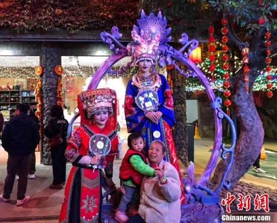 开幕式现场,游客与身穿民族服饰的工作人员合影。莫伟雯 摄
