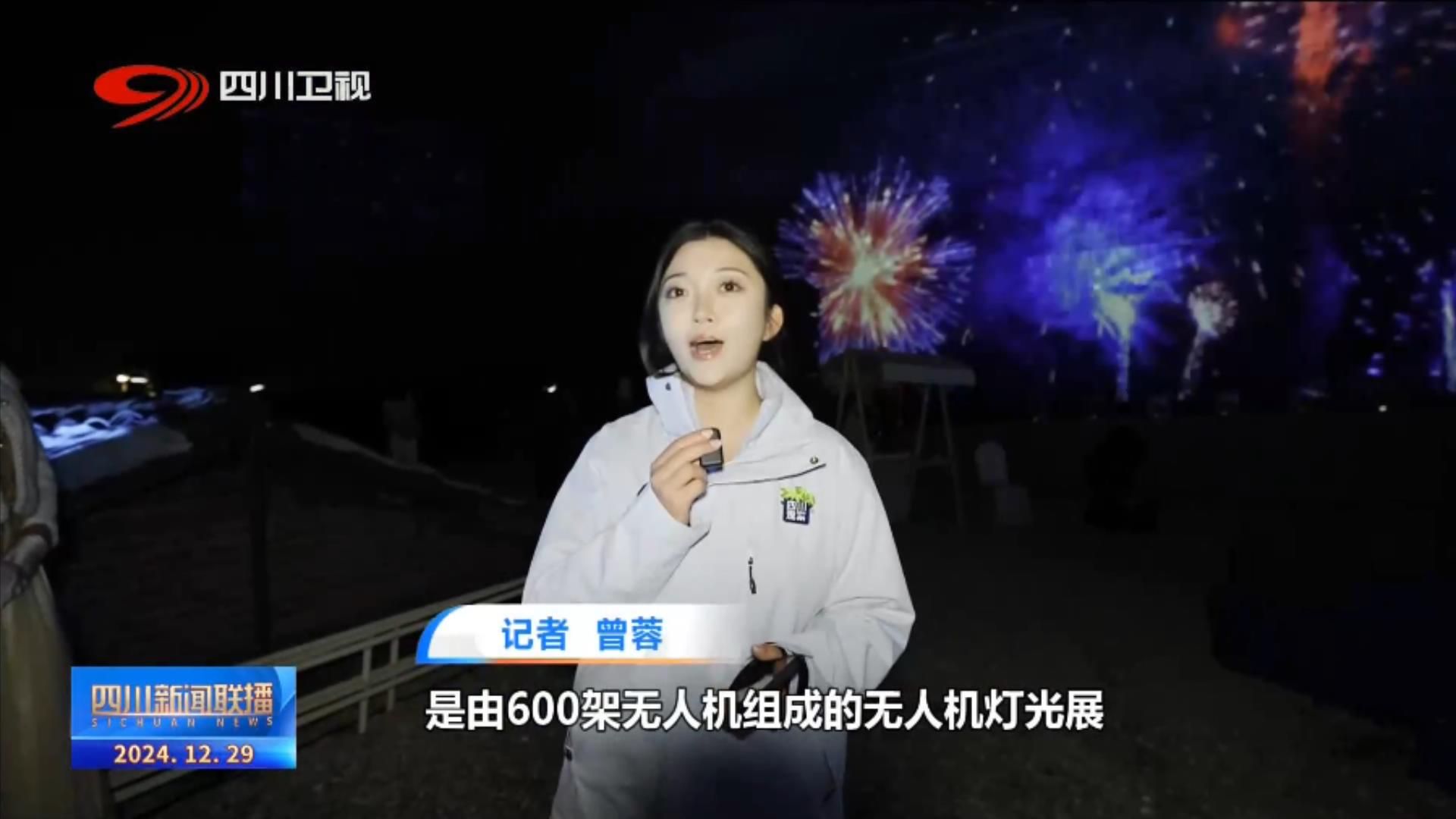 记者 曾蓉:在我身后正在绽放的是由600架无人机组成的无人机灯光展,此次这个灯光展总共含有13组灯光,其中包含我们的乐山大佛、金顶、还有我们《只有峨眉山》戏剧,以及我们一系列的关于本届乐山峨眉山市冰雪温泉季的文创元素。