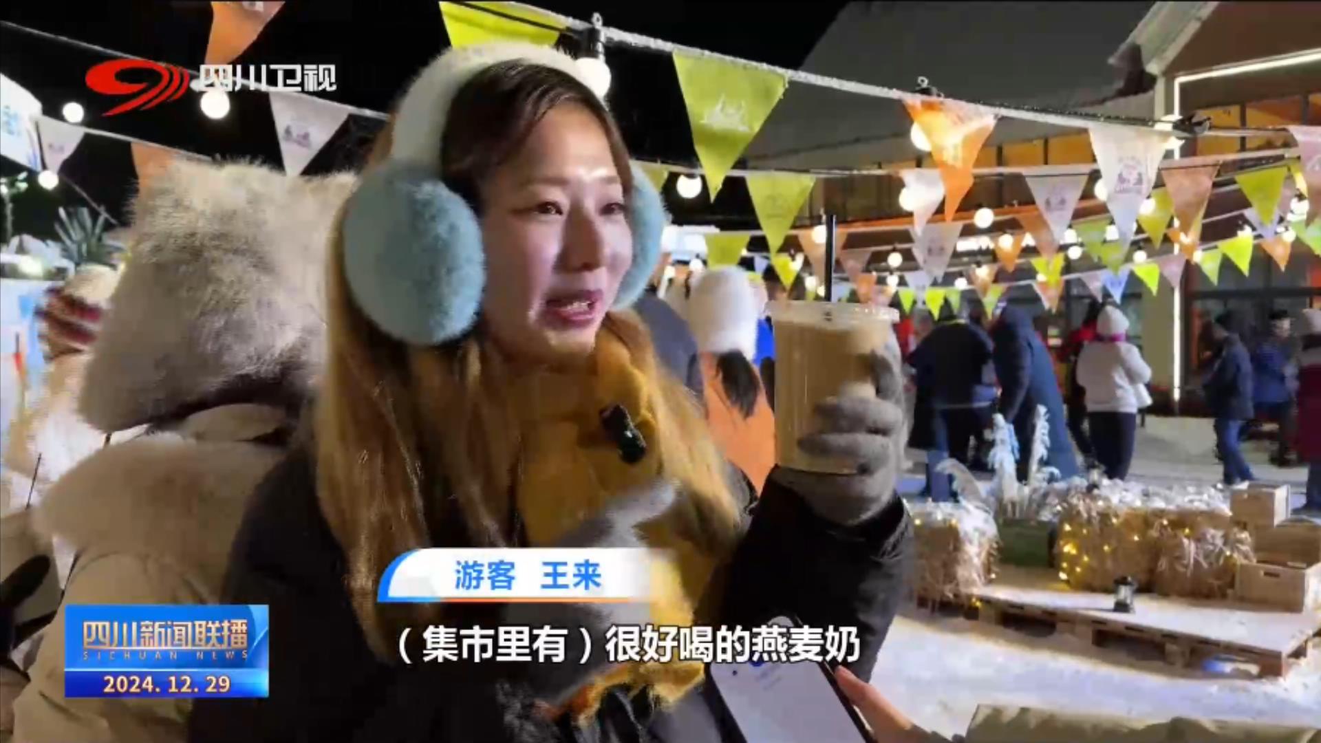 游客王来:(集市里有)很好喝的燕麦奶,还有各种美食,灯光也非常好看。这个氛围特别好,非常推荐大家来西岭雪山玩。