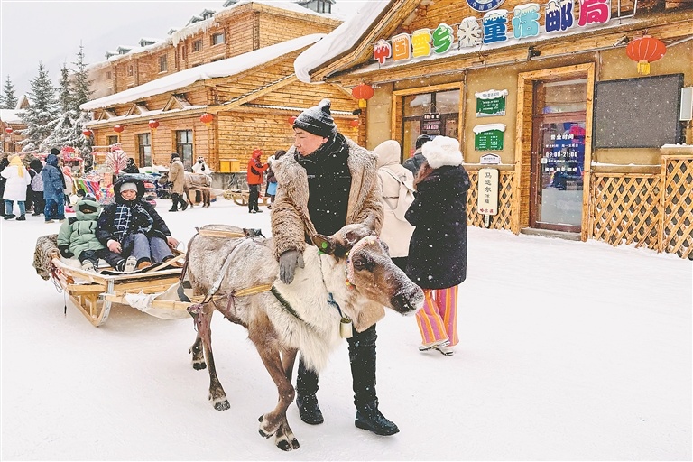 图为在雪乡景区,游客体验东北特色鹿拉爬犁。新华社发