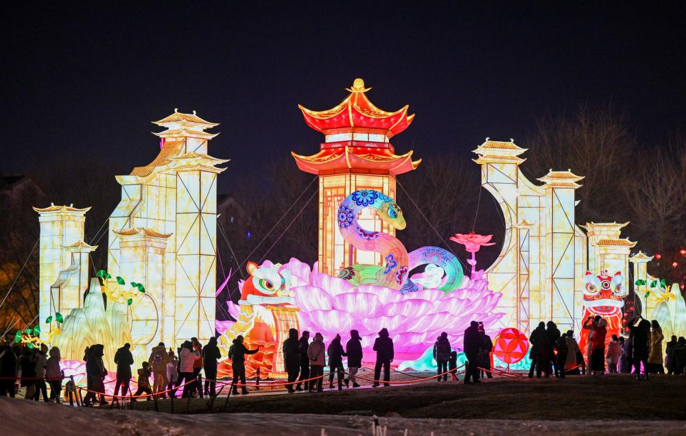 2024年12月31日晚,人们在呼和浩特市小草公园观赏彩灯。新华社记者 连振 摄