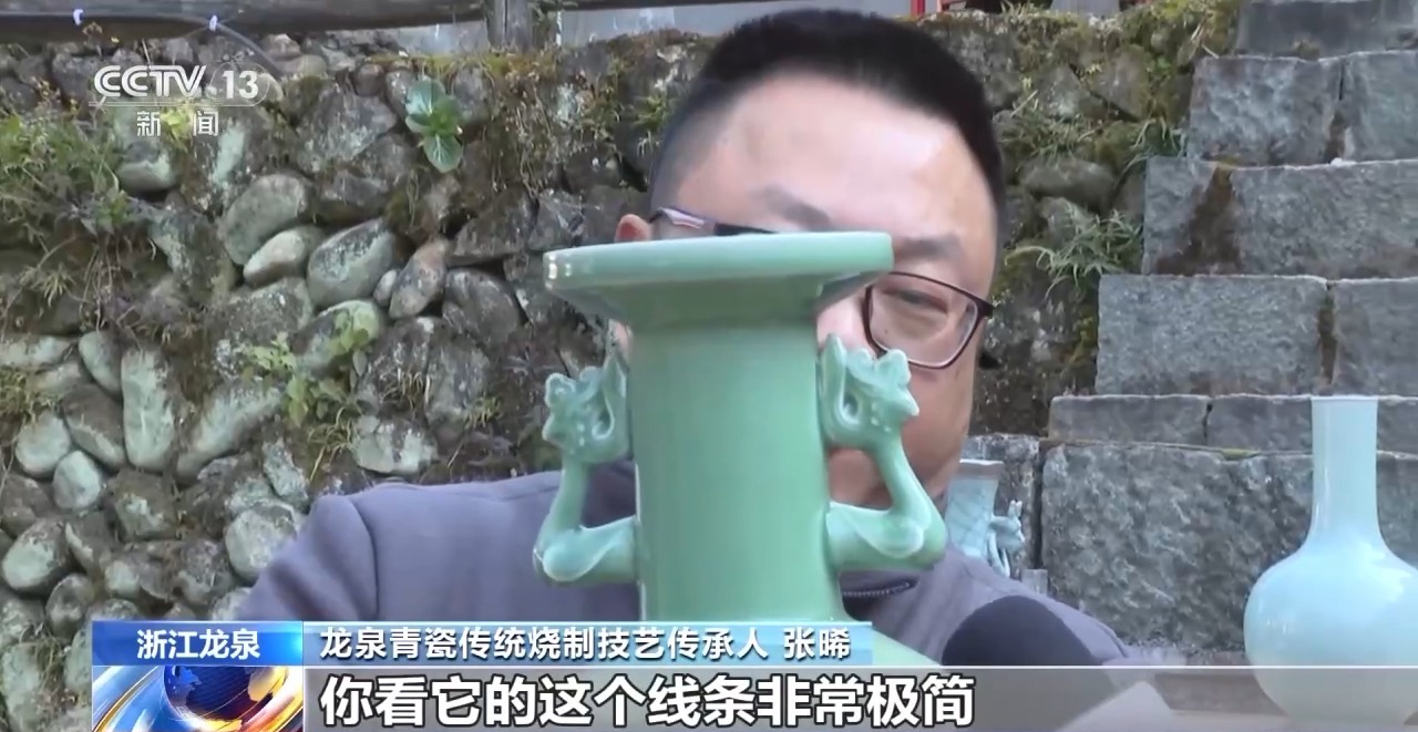 龙泉青瓷传统烧制技艺传承人 张晞:这一件器型是仿照龙泉窑南宋时期的经典器型——凤耳瓶,它的线条是极简和挺拔的,釉色温润,青翠欲滴。这其实就是龙泉青瓷的亮点,叫作“青如玉”。