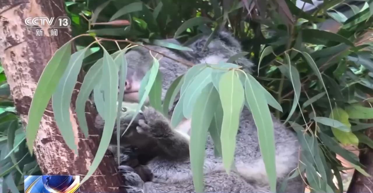 南京红山动物园考拉馆饲养员 陈雅莉:吃桉树叶对考拉宝宝来说只是嚼着练一练牙齿,主要还是喝妈妈的奶。