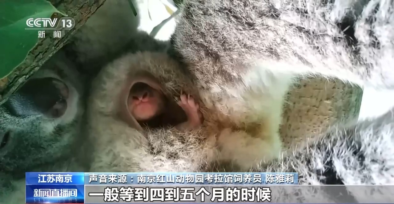 南京红山动物园考拉馆饲养员 陈雅莉:小考拉在育儿袋里面只吃妈妈的奶,那时候育儿袋是闭合的状态,相当于一个无菌环境。一般等到四至五个月的时候,宝宝开始露爪露头,育儿袋袋口会渐渐打开。