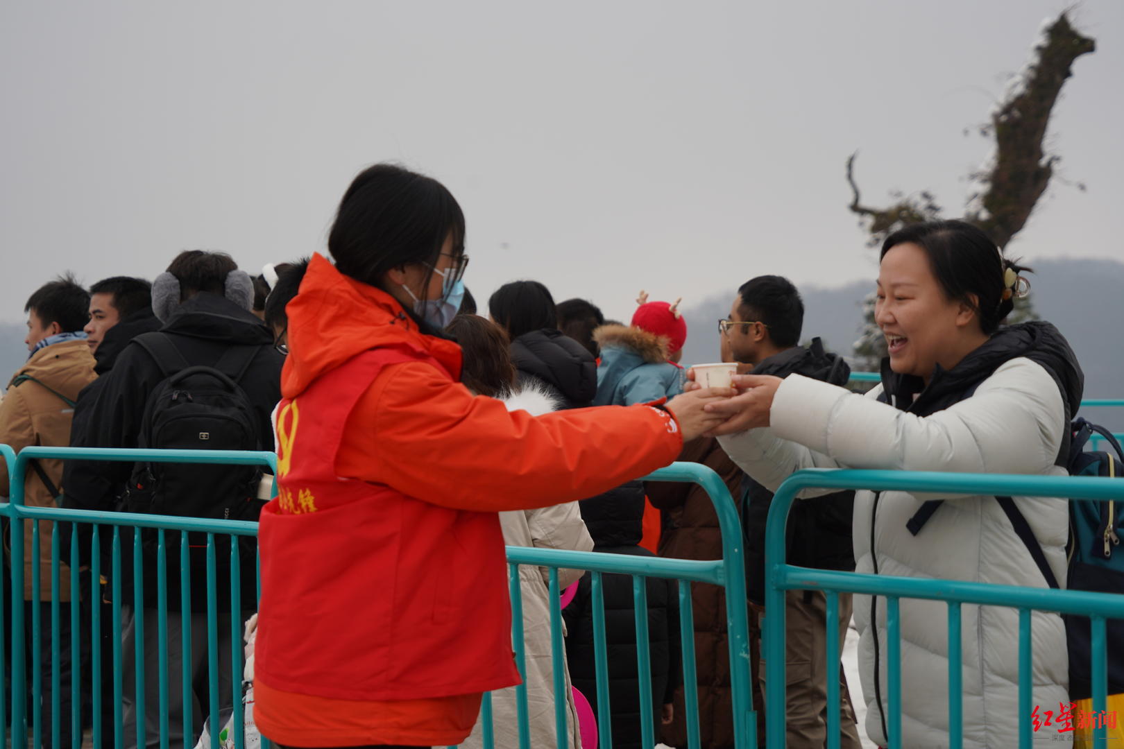 尽管不是节假日,雪场依然人气爆棚,工作人员正为游客们端来一杯杯热气腾腾的开水。“这是今年新增的另一项暖心服务。”