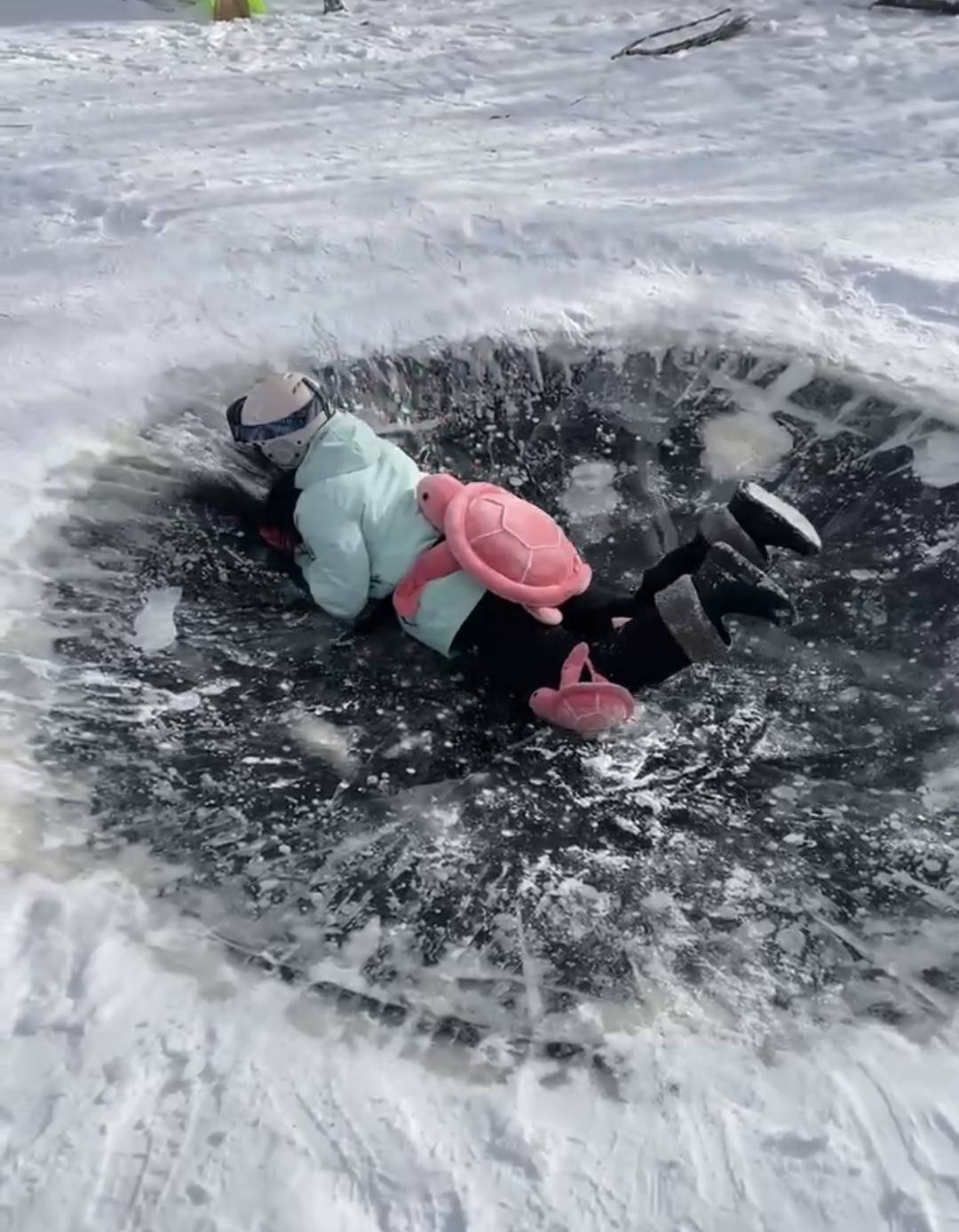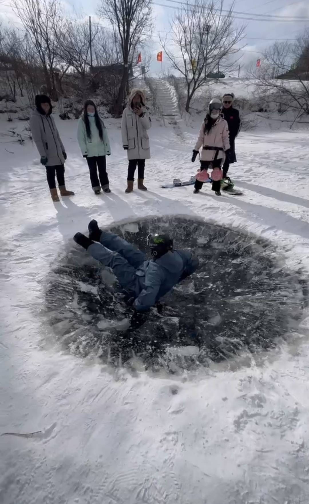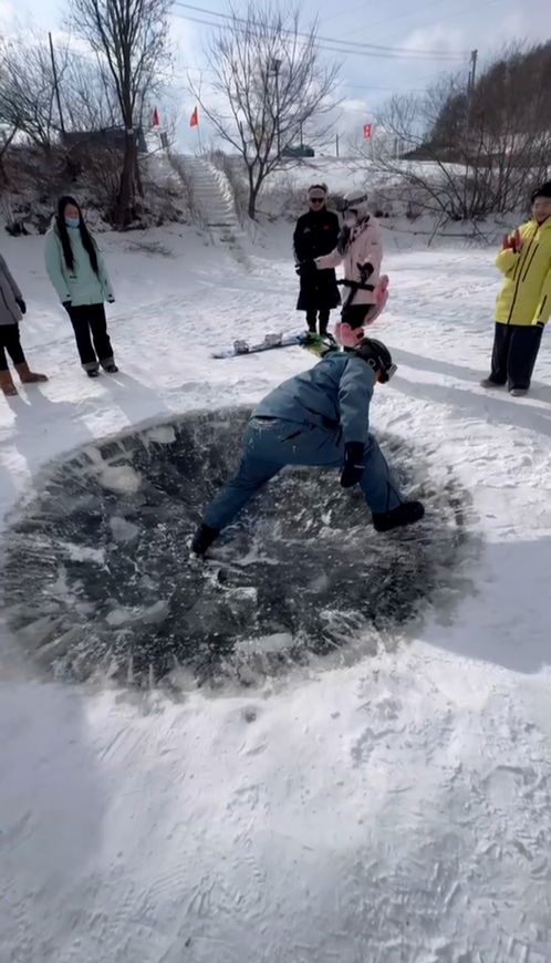 “冰坑挑战”在社交媒体上走红,也有不少网友质疑其安全隐患,这个冰面裂开了怎么办?人会不会掉下去?
