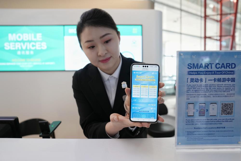 1月8日,在北京首都国际机场T3航站楼的“北京服务”机场服务点,一名中国移动的工作人员在展示为外籍人士提供的手机SIM卡流量套餐。新华社记者 鞠焕宗 摄