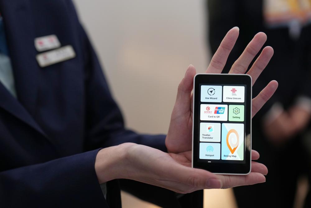 1月8日,在北京首都国际机场T3航站楼的“北京服务”机场服务点,一名中国联通的工作人员在展示一款集成了通信、支付等多种功能的便携终端。新华社记者 鞠焕宗 摄