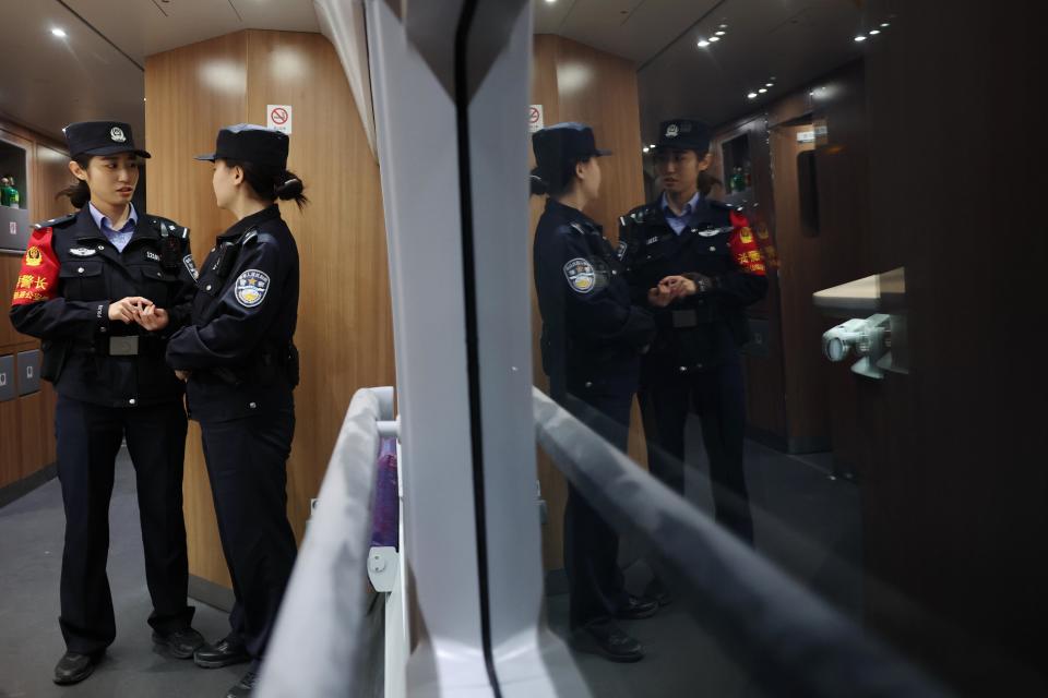“车厢内请勿吸烟,陌生短信链接不要点击,请看管好自己的随身物品……”在兰州西开往荣城的G2146次高铁列车上,当班乘警冯丽萍和周慧一边巡视车厢,一边向旅客进行安全提示。11个小时的值乘,她们能走1万多步。