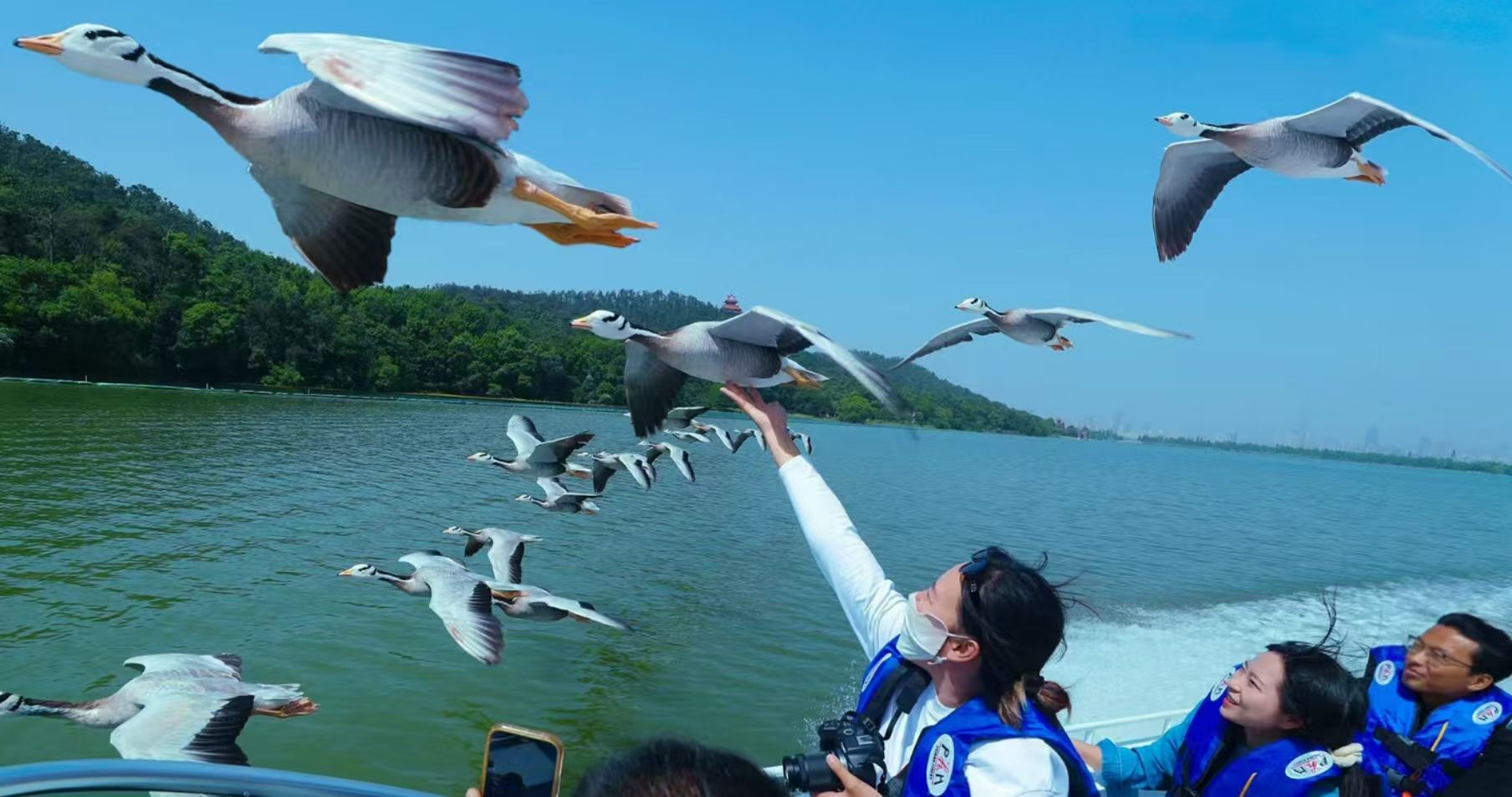 大雁在东湖伴飞,越来越丰富的动植物在此栖居。景区供图