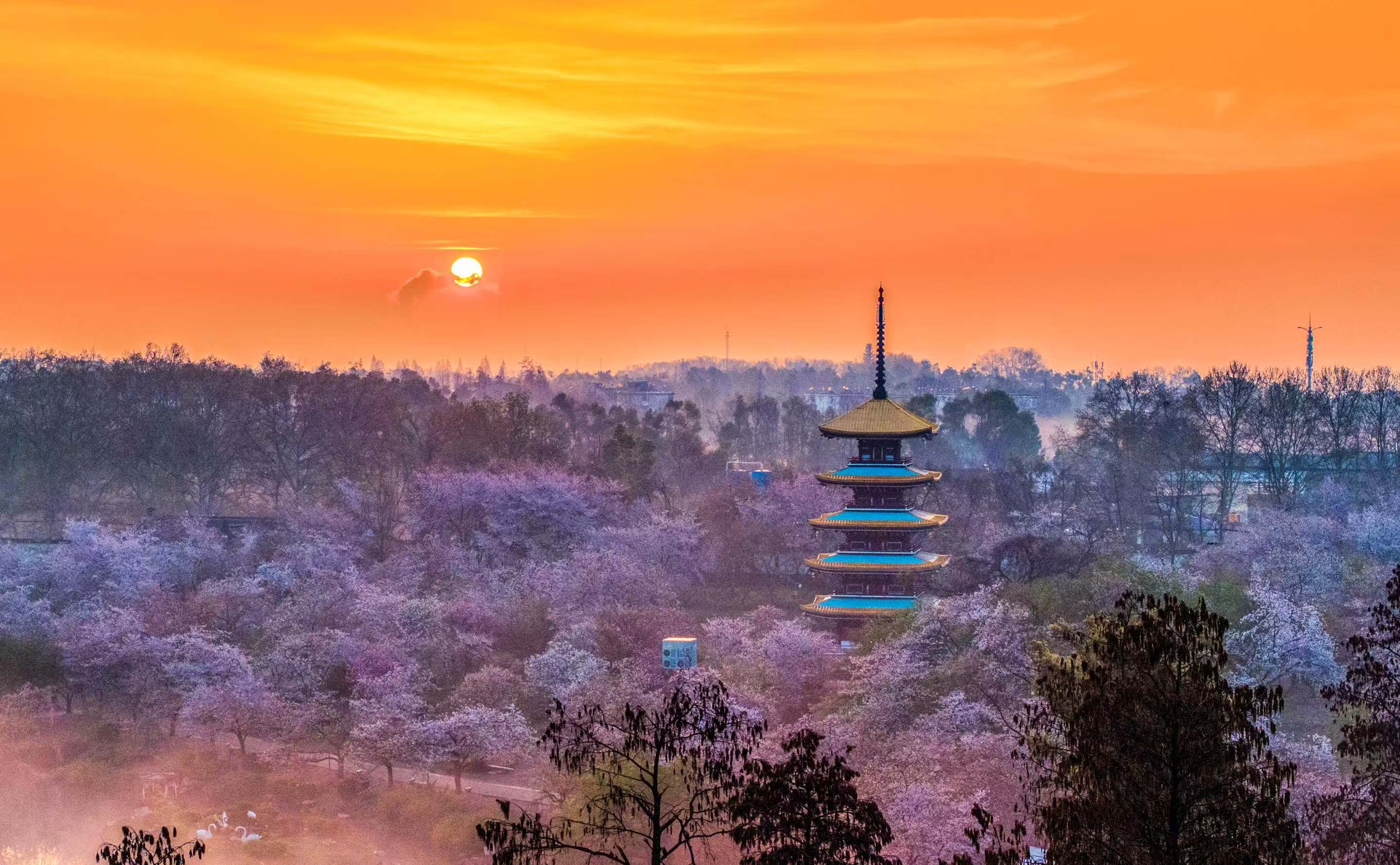 东湖四季花开不断,春季樱花吸引八方游客。