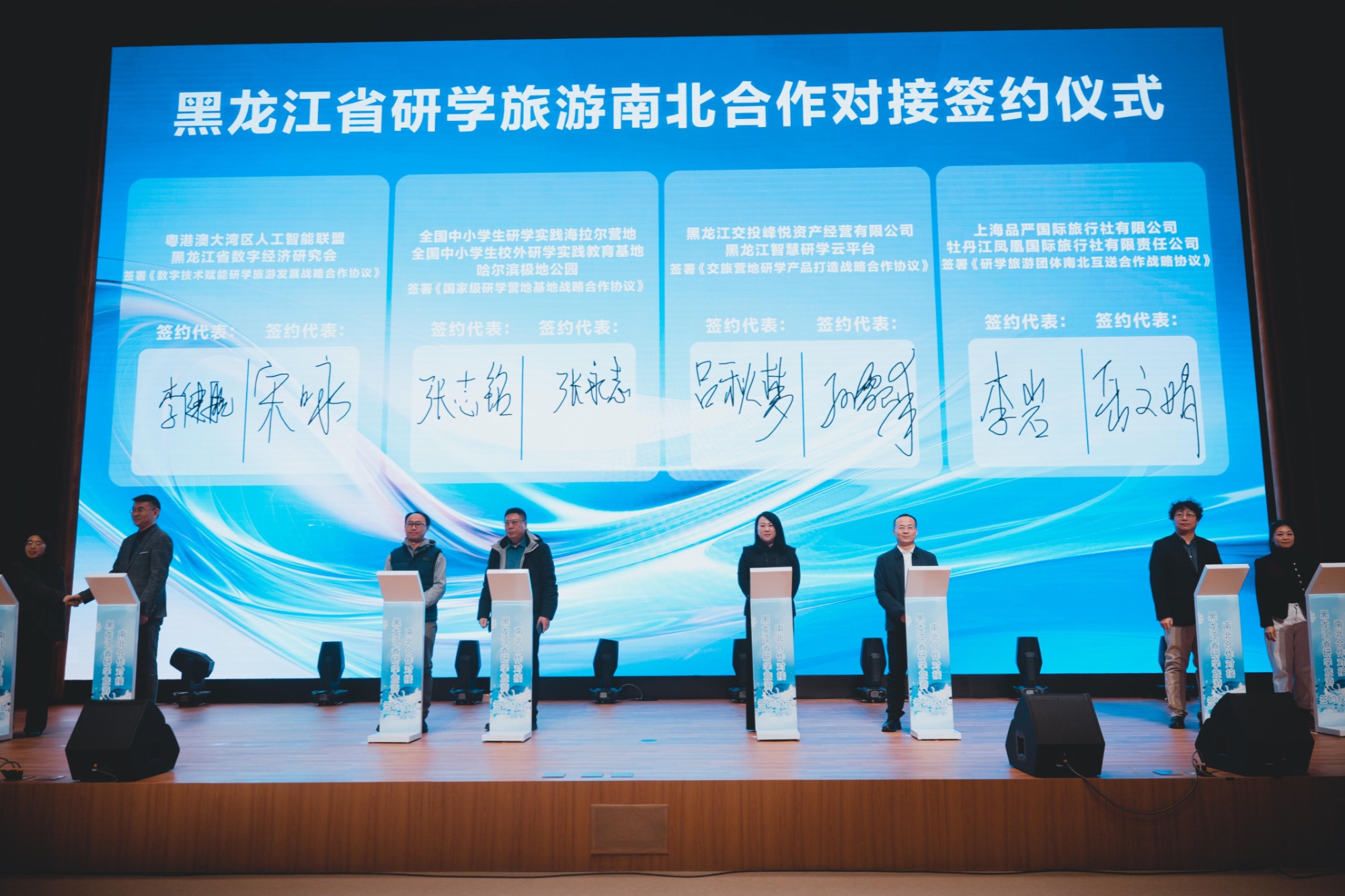会上,黑龙江省文化和旅游厅还对“青春年华?花样冰雪”雪韵龙江短视频挑战赛进行了启动,向全国各地的青少年发出了《冰城少年的研学旅游邀约信》,进行了《滑雪吧!少年》研学旅游团首发仪式,发布了四季五个主题10条研学旅游精品线路,五家省内外研学旅游企业分别做了南北研学旅游资源推介,八家不同领域研学旅游企业代表签署了国家级研学基地营地、数字技术赋能研学旅游发展等战略合作协议。会后,还将开展南北合作交流洽谈和研学旅游基地(营地)及线路踏查活动。