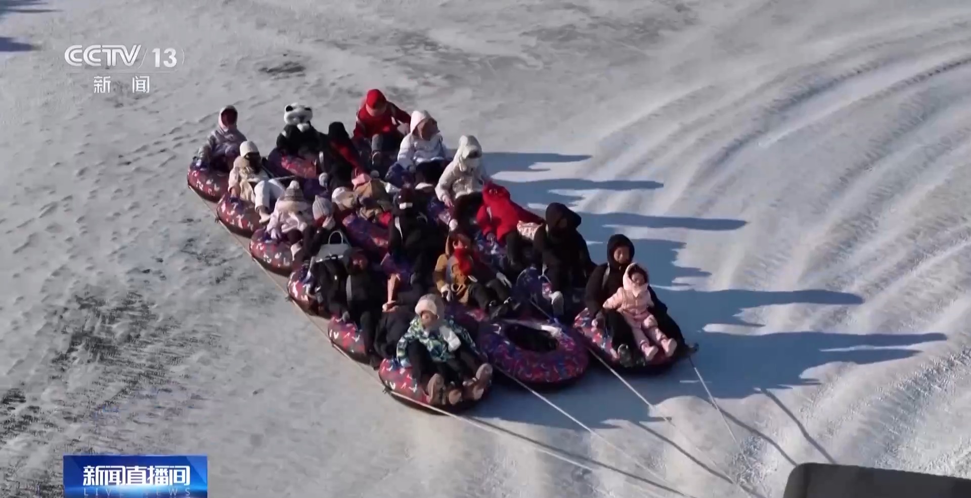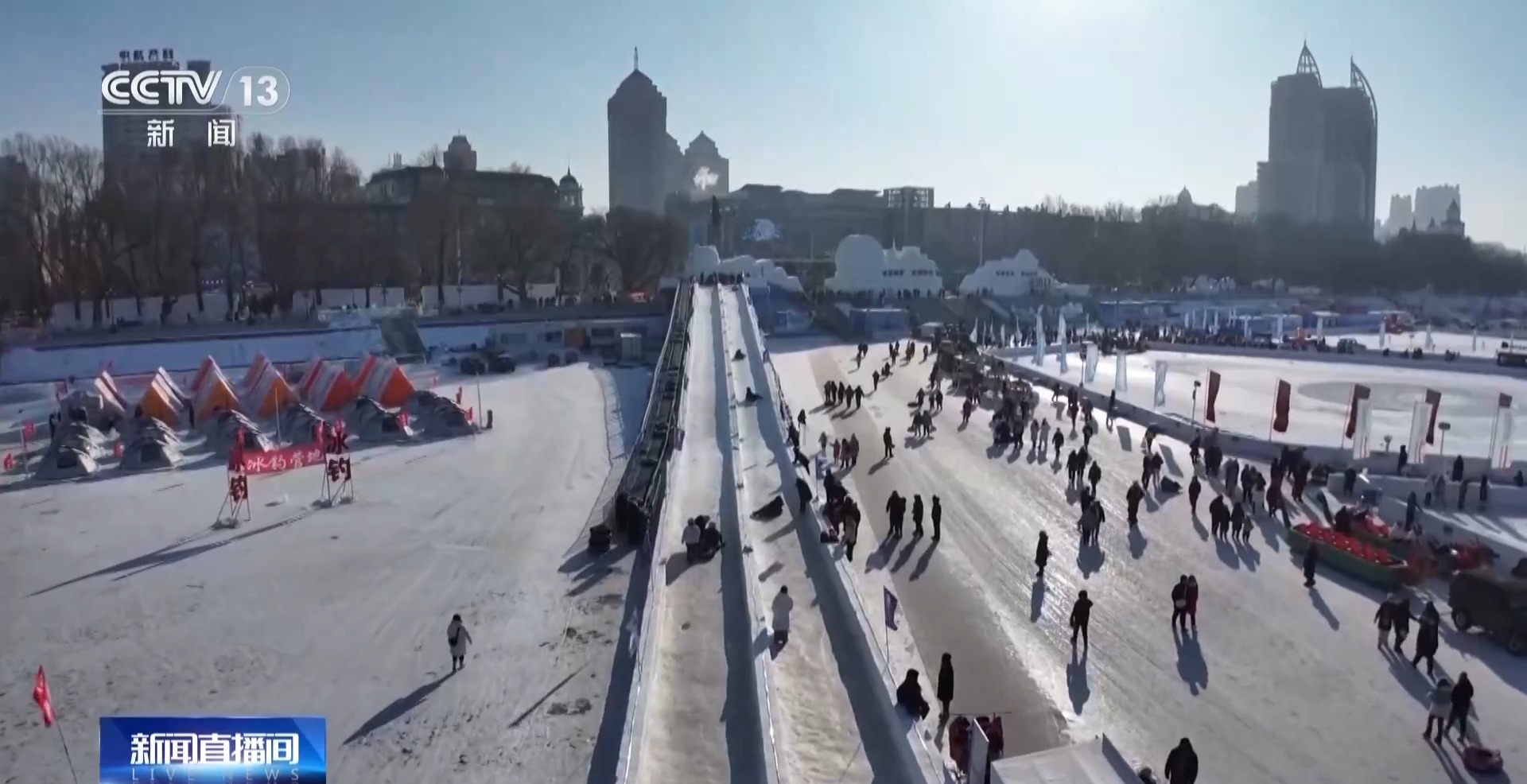 哈尔滨松花江冰雪嘉年华开发运营部部长何礼:欢乐雪滑梯、超级冰滑梯,还有疯狂八爪鱼,还有旁边的雪圈极速漂移,这都是我们的明星项目,也是深受游客朋友喜爱的项目。