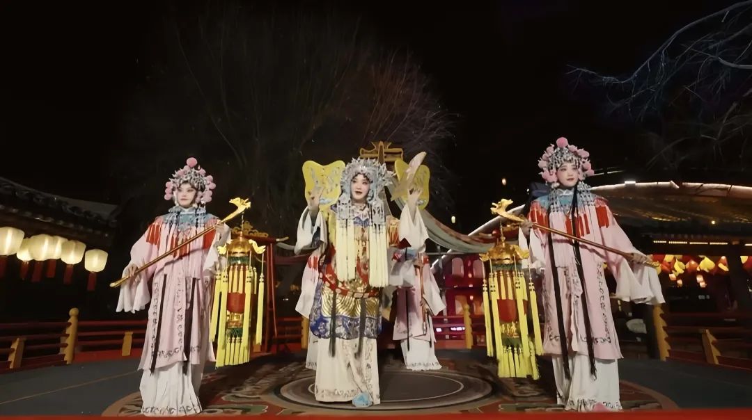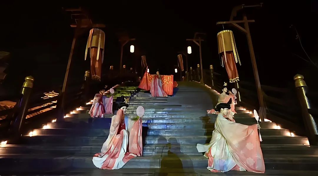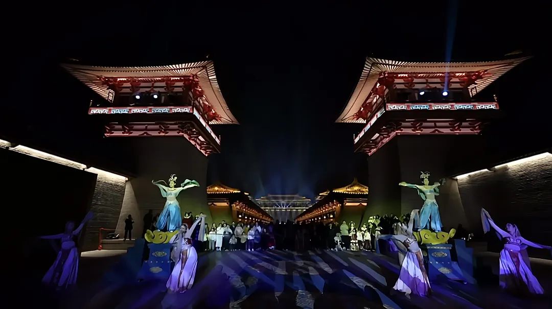 华灯初上,飞檐翘角、气势恢宏的唐城,上演着一幅行进中的《襄阳夜游图》。明德门前壮士凯旋,鼓乐齐鸣;游人如织、烟火升腾的东市,市井杂耍热闹开场。在夜色的衬托下,四季虹桥一众舞者轻舒长袖,袅袅娜娜,一曲脍炙人口的京剧选段《贵妃醉酒》更是让线下游客、线上网友梦回唐朝。