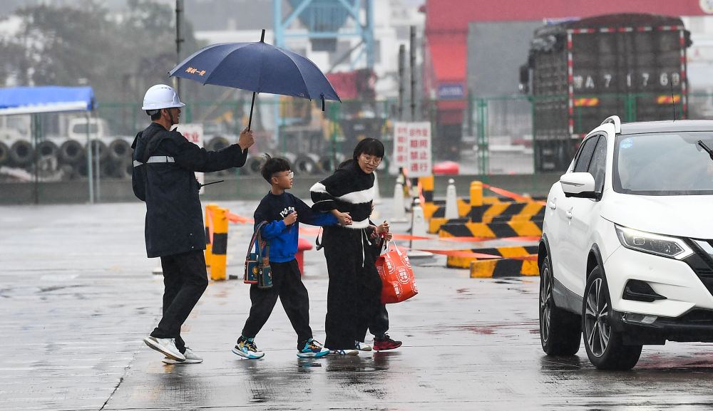 1月14日,在海南省海口市秀英港,工作人员为准备乘船的旅客打伞。新华社记者 杨冠宇 摄