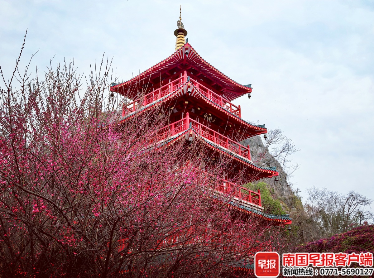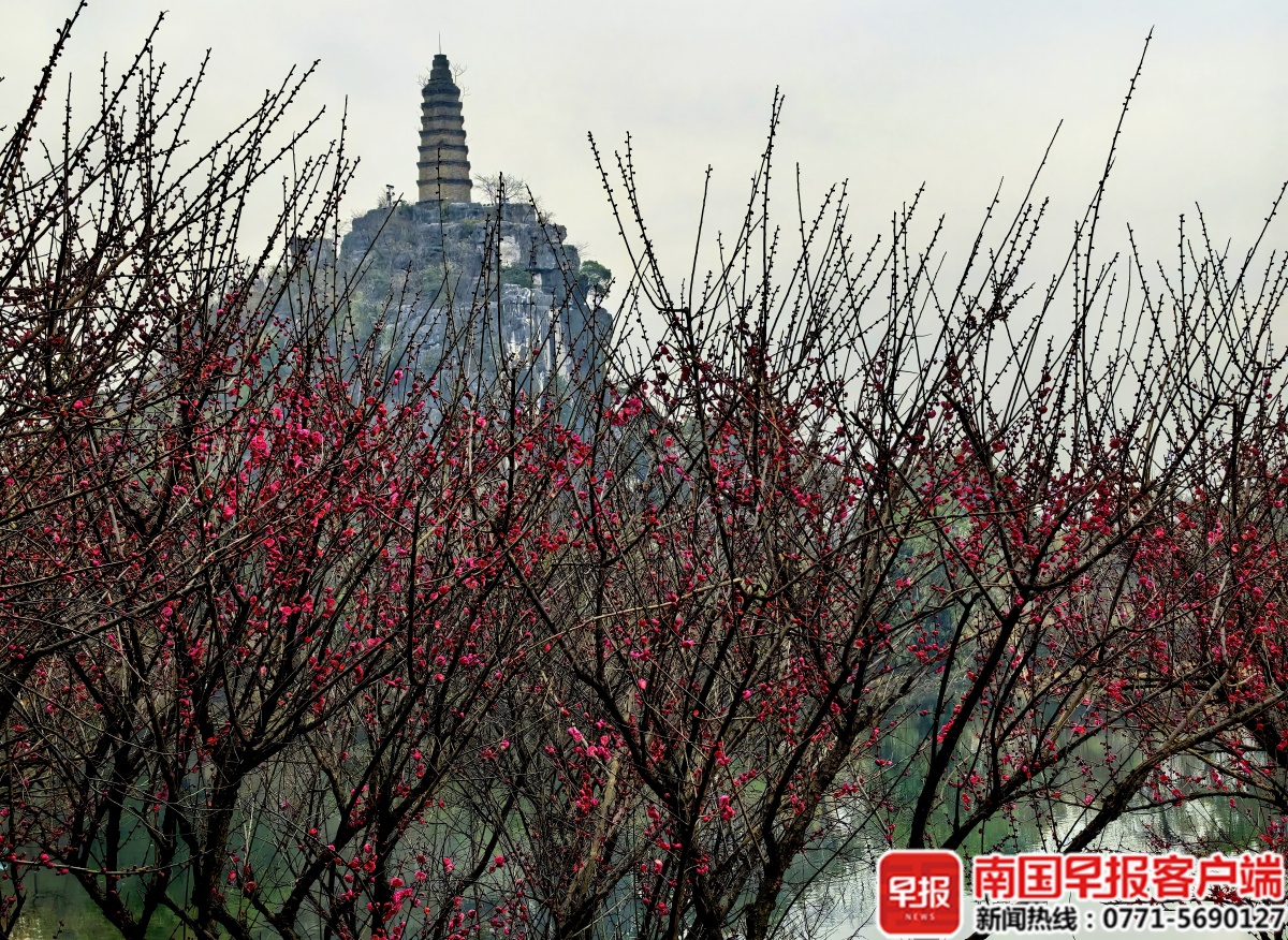 在桂林市虞山公园的五福塔前,梅花竞相绽放,许多市民在树下打卡拍照。这些梅花都是虞山公园自1999年建园以来,市民参加春季义务植树活动种下的。