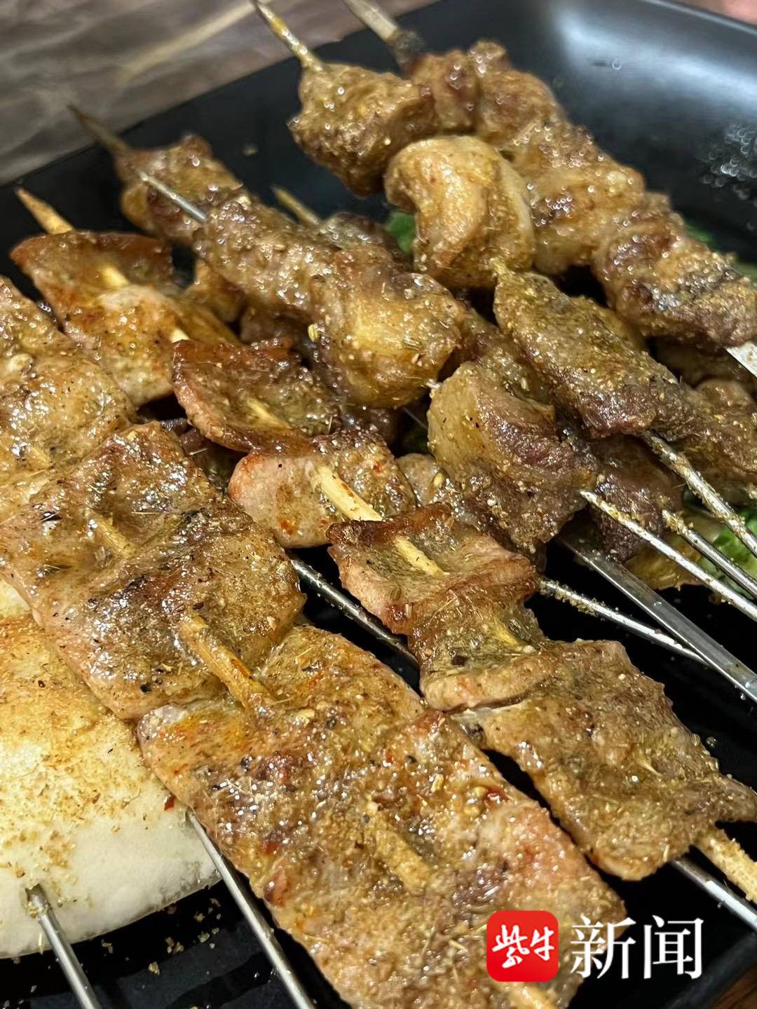 和其他地区相比,徐州烧烤的独到之处在于食材的多样性。除了常见的各种肉串、蔬菜,光是羊就被他们吃出了多种花样。羊眼、羊头、羊排、羊球、羊蹄、羊尾……几乎羊身上的每个部位都加入了“徐州烧烤俱乐部”。此外,一口咬下满嘴冒油的油包肝,外焦里嫩的烤“知了猴”也是不容错过的特色菜品。
