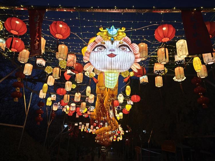 千佛山风景名胜区5000余盏红灯笼错落有致地分布在北门、南门等主要景点、道路和广场,将景区装点得红火喜庆。蛇年花灯成为一大亮点,北门广场和主山路的两组花灯色彩艳丽、造型活泼。特别是主山路约300米长的萌蛇造型花灯,由灯笼组成蜿蜒身形,寓意“登高祈福·祥蛇献瑞”,给游客带来强烈的视觉冲击。