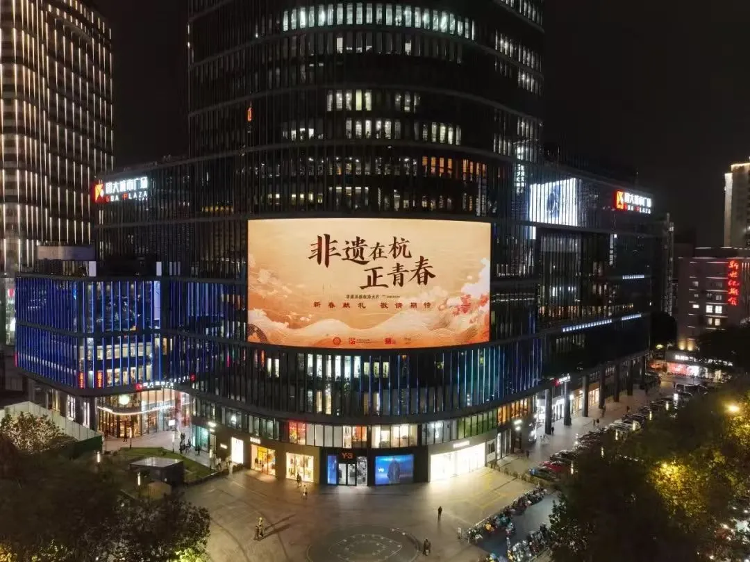 武林商圈国大广场大屏播放“非遗在杭正青春”视频。图源杭州市文化馆微信公众号