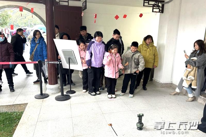 “花明楼福韵”活动则充满了浓浓的年味。游客们兴致勃勃地参与投壶游戏,投中者即可领取书法家亲手书写的“福”字。大家在欢声笑语中体验传统春节习俗,亲身感受传统文化的独特魅力,现场热闹非凡。