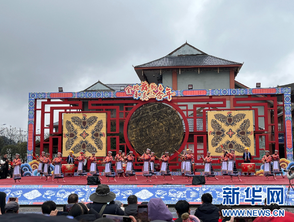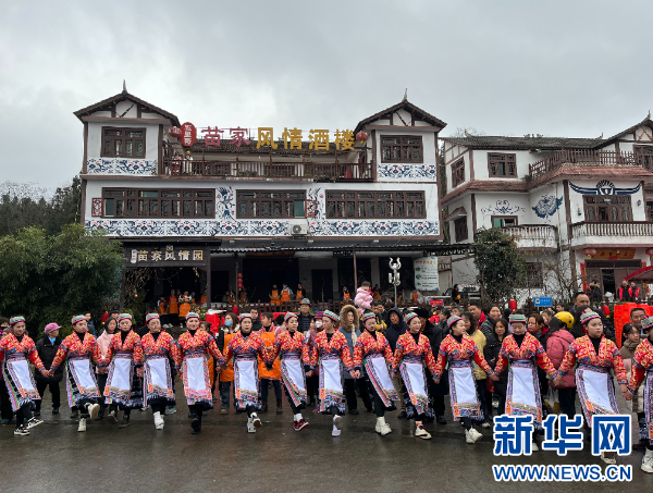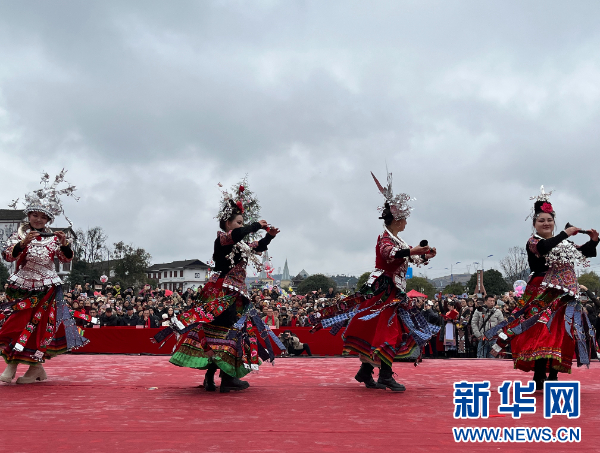 2月6日,三合苗寨苗族跳花节上民族歌舞表演。新华网 黄勇摄