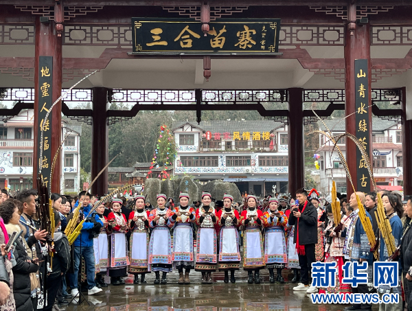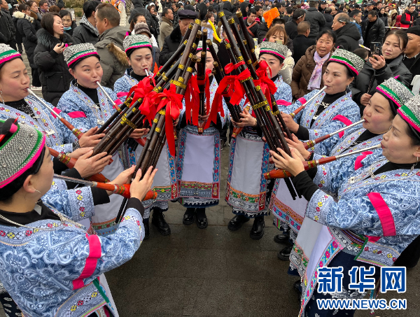 2月6日,三合苗寨苗族跳花节上的芦笙吹奏表演。新华网 黄勇摄