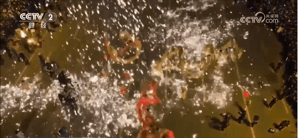 夜幕下,两只雄狮在鼓点中竞相舞动,时而摇头摆尾,时而欢腾跳跃,彩龙船、水族精灵等表演也精彩上演,让人们近距离感受传统民俗文化魅力。随着舞动龙身,摆弄龙尾,打铁水的匠人将上千度的铁水击向天空,铁花飞溅,火龙舞动穿梭在漫天铁花之中,呈现出“人在火中舞,龙在火中飞”的景象。