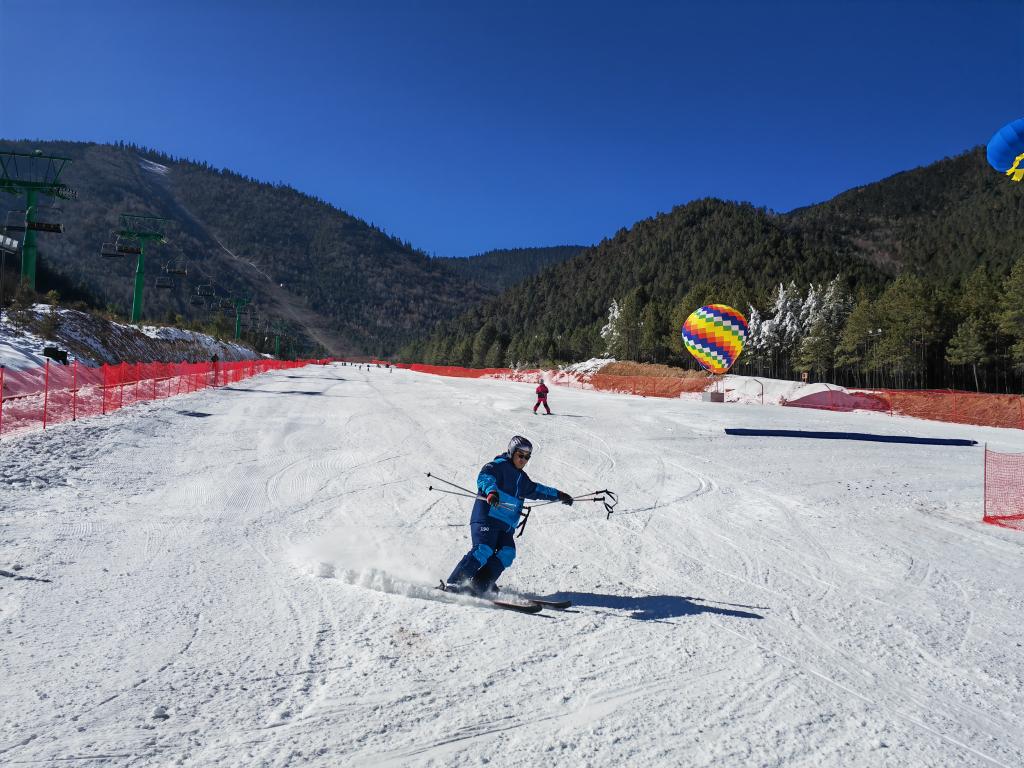2024年12月28日,游客在云南省迪庆州香格里拉市的七星雪滑雪场滑雪。新华社记者浦超摄
