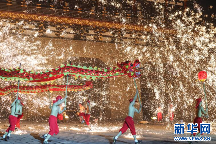 图为2月2日,民间艺人在襄阳市唐城景区为游客表演“火龙钢花”。新华网发 杨东 摄
