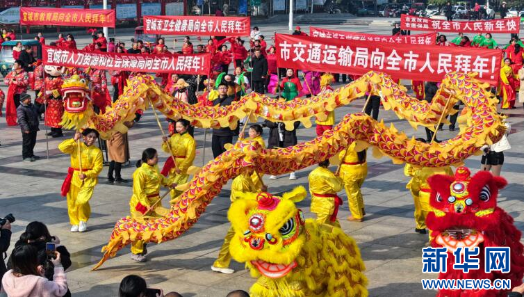 图为1月29日,农历正月初一,宜城市举行了以龙灯、狮子、腰鼓、秧歌、旱船、蚌壳、老背少等表演形式为主的民俗巡演活动。新华网发 郑新涛 摄