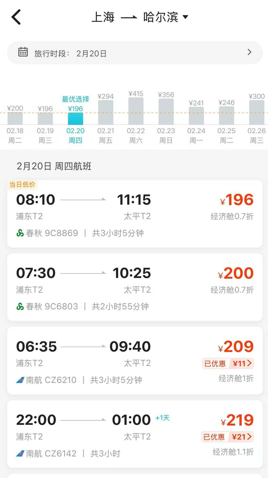 记者还注意到,一些航空枢纽城市,如北京、上海、武汉、成都、广州等地出发的机票,基本上都能看到低至200元的航线,折扣跌至不足一折。例如,近期北京飞海口的机票价格只需240元,0.8折,上海飞哈尔滨票价也只需196元,0.7折。